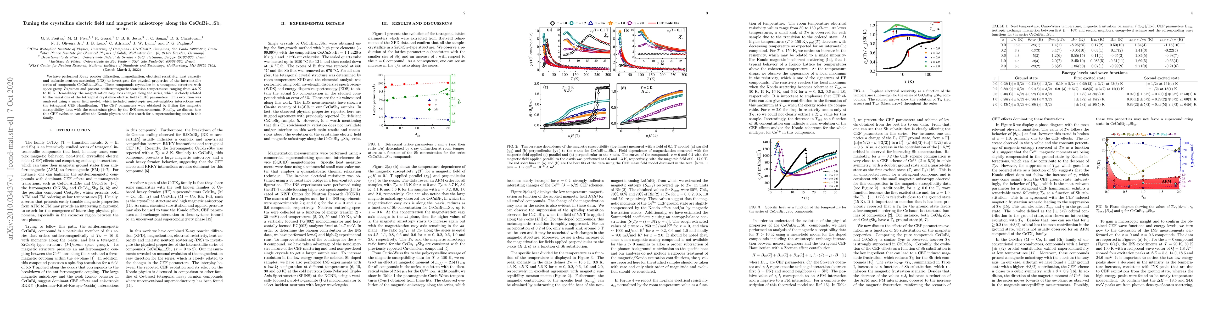 The paper examines the CeCuBi$_{2-x}$Sb$_{x}$ series, revealing that the magnetization easy axis changes due to variations in tetragonal crystalline electric field (CEF) parameters. This evolution was analyzed using a mean field model and INS measurements, impacting Kondo physics and superconductivity potential in the series.