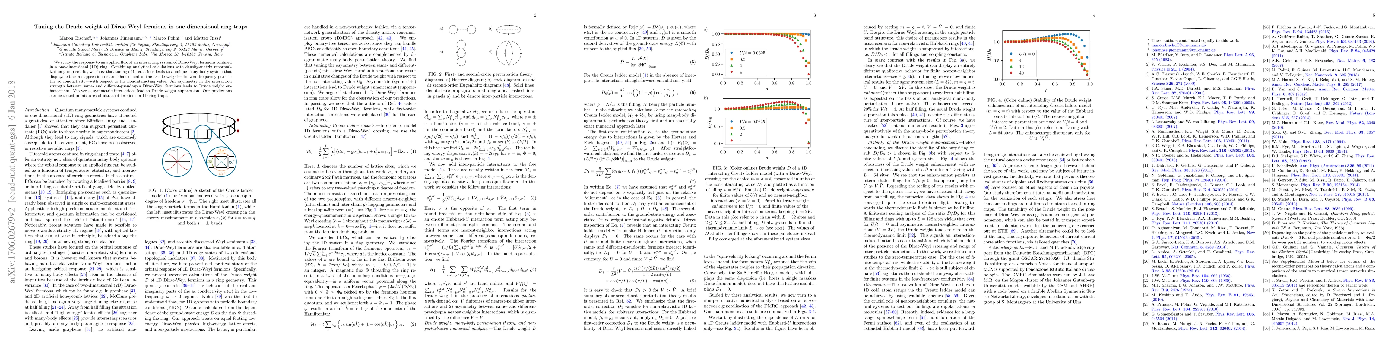 Summary: This study explores how interactions in a 1D ring of Dirac-Weyl fermions affect their Drude weight, revealing that asymmetric interactions enhance while symmetric interactions suppress the Drude weight, which could be experimentally verified using ultracold fermions in ring traps.