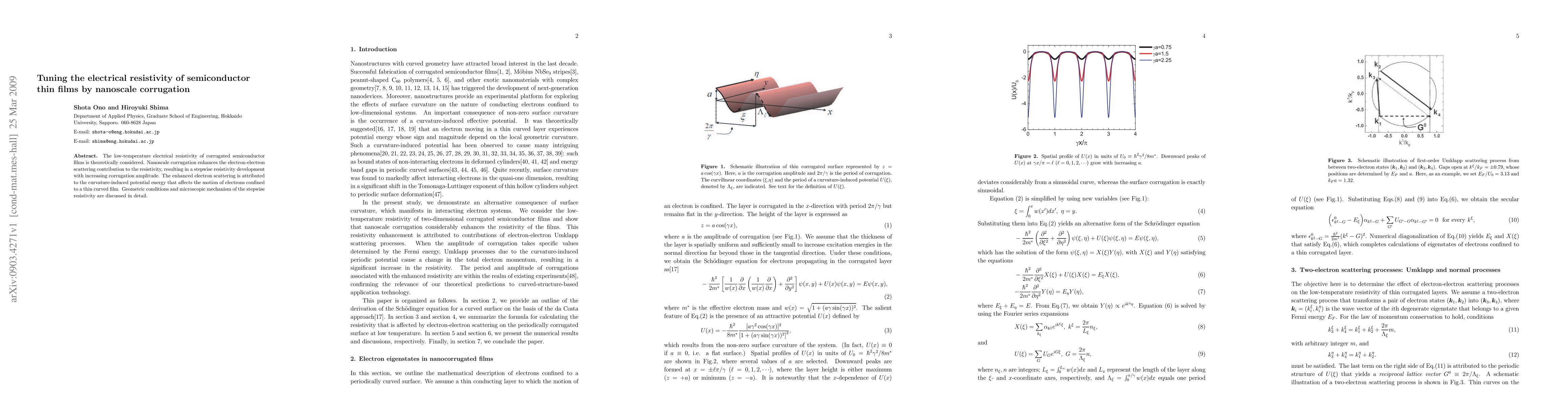 This paper explores how nanoscale corrugation in semiconductor thin films increases low-temperature electrical resistivity through enhanced electron-electron scattering, attributing the effect to curvature-induced potential energy affecting electron motion. The study details the geometric conditions and microscopic mechanisms behind the stepwise resistivity increase with corrugation amplitude.