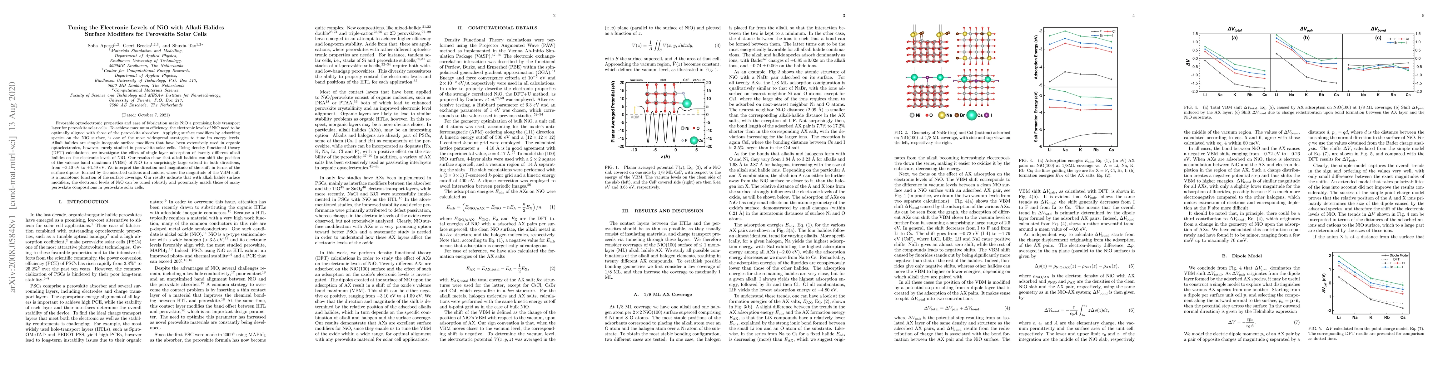 This study investigates the use of alkali halide surface modifiers to tune the electronic levels of NiO for perovskite solar cells, finding that these modifiers can significantly shift the valence band maximum, potentially optimizing the hole transport layer's efficiency. Density functional theory calculations reveal a large range of valence band shifts, attributed to surface dipoles formed by adsorbed cations and anions.