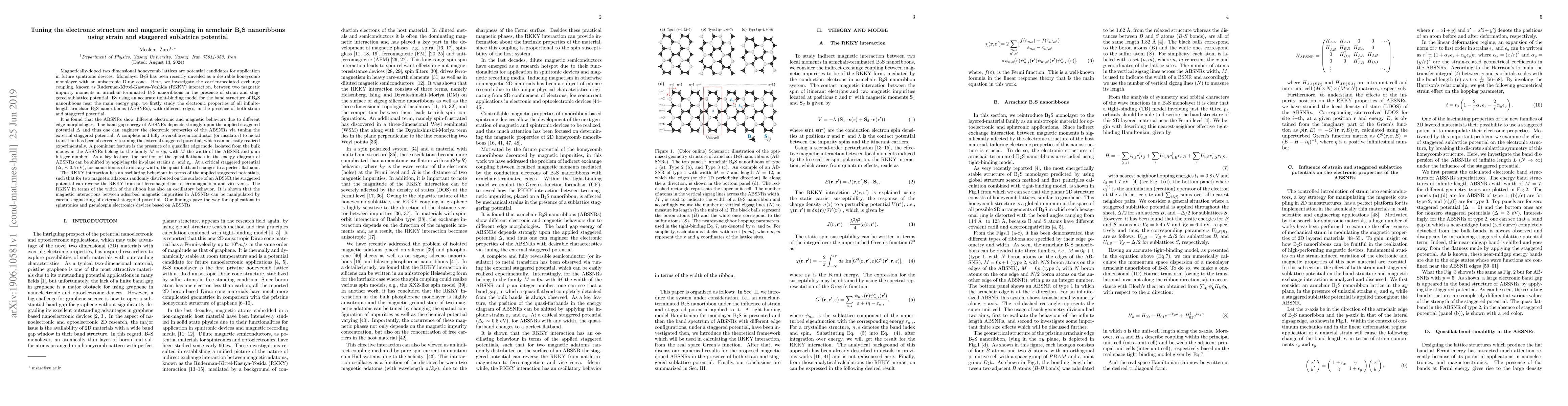 This paper explores the electronic and magnetic properties of armchair B$_2$S nanoribbons, demonstrating that strain and staggered sublattice potential can tune their electronic structure and magnetic coupling. The study reveals a reversible semiconductor-to-metal transition and a quasiflat edge mode, with the RKKY interaction showing an oscillating behavior that can be controlled by the potential, suggesting potential for spintronics applications.