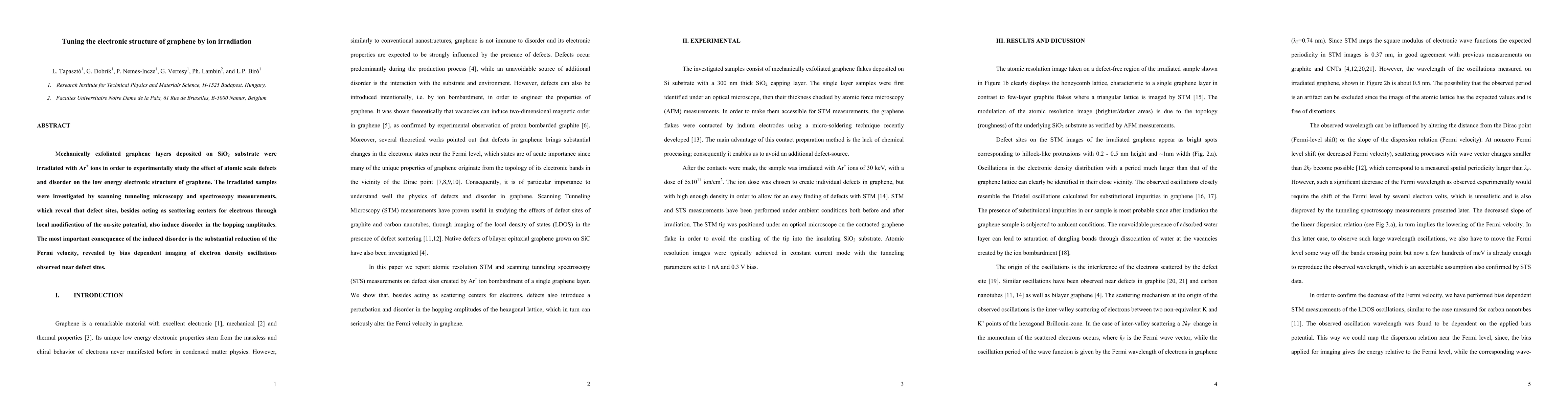 Mechanically exfoliated graphene layers deposited on SiO2 substrate were irradiated with Ar+ ions in order to experimentally study the effect of atomic scale defects and disorder on the low-energy electronic structure of graphene. The irradiated samples were investigated by scanning tunneling microscopy and spectroscopy measurements, which reveal that defect sites, besides acting as scattering centers for electrons through local modification of the on-site potential, also induce disorder in the hopping amplitudes. The most important consequence of the induced disorder is the substantial reduction in the Fermi velocity, revealed by bias-dependent imaging of electron-density oscillations observed near defect sites.