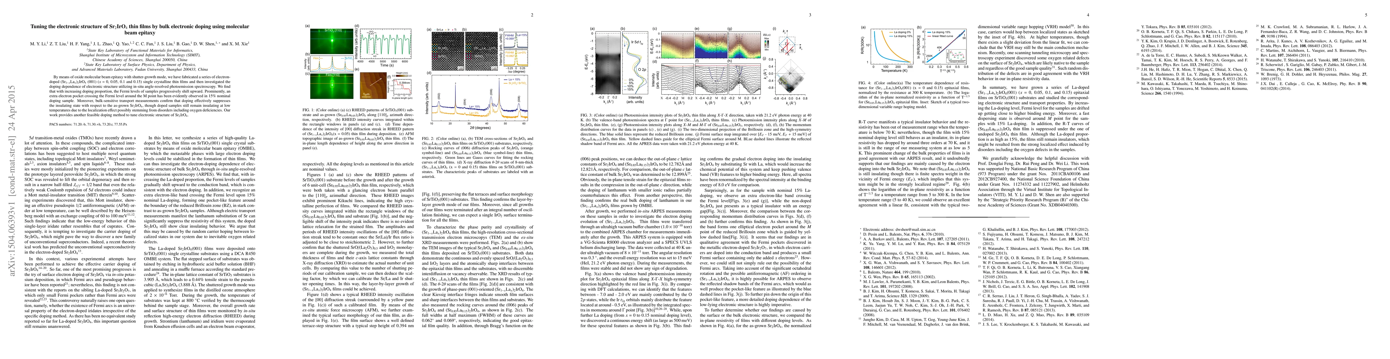 This paper reports on the fabrication of electron-doped Sr2IrO4 thin films using molecular beam epitaxy, revealing an upward shift in Fermi levels and the emergence of an extra electron pocket with increased doping, while transport measurements show suppression of the insulating state.