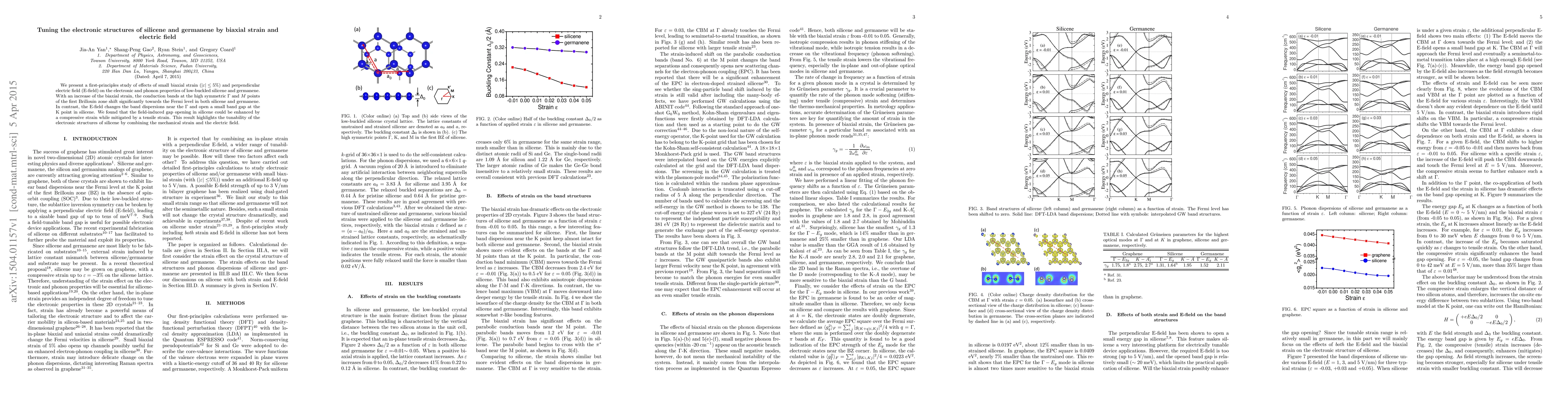 This research explores how small biaxial strain and electric fields can modify the electronic properties of silicene and germanene. Biaxial strain shifts conduction bands towards the Fermi level, while electric fields open a small band gap in silicene, with strain further enhancing or mitigating this effect.