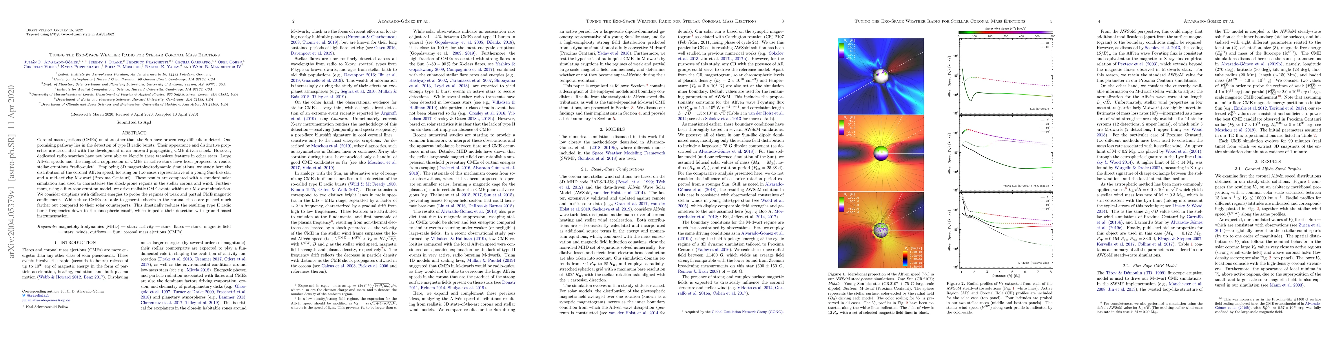 Coronal mass ejections (CMEs) on stars other than the Sun have proven very difficult to detect. One promising pathway lies in the detection of type II radio bursts. Their appearance and distinctive properties are associated with the development of an outward propagating CME-driven shock. However, dedicated radio searches have not been able to identify these transient features in other stars. Large Alfv\'en speeds and the magnetic suppression of CMEs in active stars have been proposed to render stellar eruptions "radio-quiet". Employing 3D magnetohydrodynamic simulations, we study here the distribution of the coronal Alfv\'en speed, focusing on two cases representative of a young Sun-like star and a mid-activity M-dwarf (Proxima Centauri). These results are compared with a standard solar simulation and used to characterize the shock-prone regions in the stellar corona and wind. Furthermore, using a flux-rope eruption model, we drive realistic CME events within our M-dwarf simulation. We consider eruptions with different energies to probe the regimes of weak and partial CME magnetic confinement. While these CMEs are able to generate shocks in the corona, those are pushed much farther out compared to their solar counterparts. This drastically reduces the resulting type II radio burst frequencies down to the ionospheric cutoff, which impedes their detection with ground-based instrumentation.