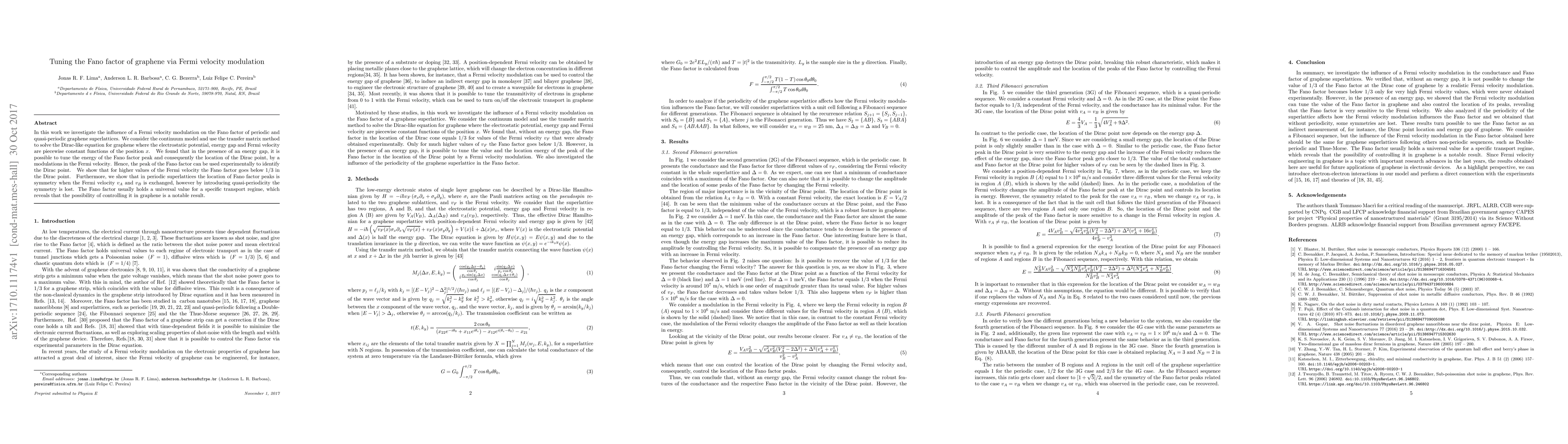 This paper explores how modulating the Fermi velocity affects the Fano factor in graphene superlattices, demonstrating that it can tune the Fano factor peak and identify the Dirac point. The Fano factor can be controlled to values below 1/3 and symmetry properties change with quasi-periodicity.