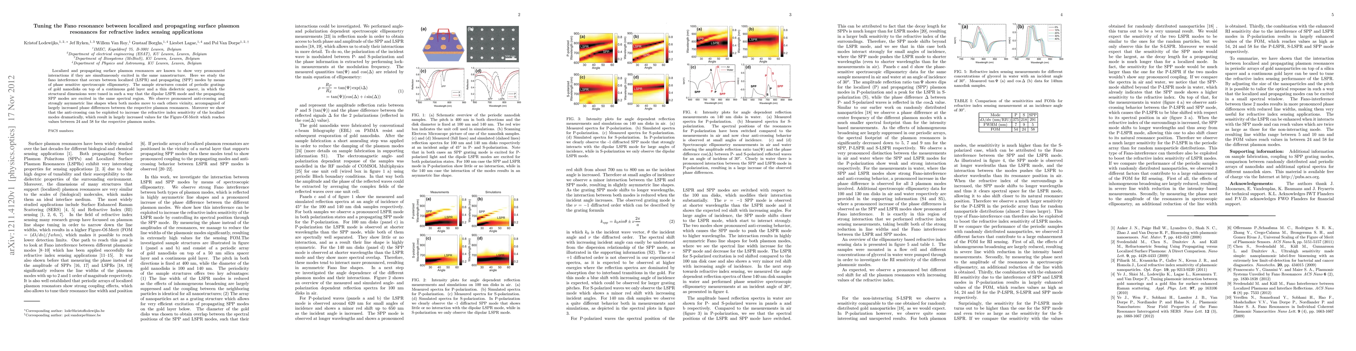 Localized and propagating surface plasmon resonances are known to show very pronounced interactions if they are simultaneously excited in the same nanostructure. Here we study the fano interference that occurs between localized (LSPR) and propagating (SPP) modes by means of phase sensitive spectroscopic ellipsometry. The sample structures consist of periodic gratings of gold nanodisks on top of a continuous gold layer and a thin dielectric spacer, in which the structural dimensions were tuned in such a way that the dipolar LSPR mode and the propagating SPP modes are excited in the same spectral region. We observe pronounced anti-crossing and strongly asymmetric line shapes when both modes move to each others vicinity, accompagnied of largely increased phase differences between the respective plasmon resonances. Moreover we show that the anti-crossing can be exploited to increase the refractive index sensitivity of the localized modes dramatically, which result in largely increased values for the Figure-Of-Merit which reaches values between 24 and 58 for the respective plasmon modes.