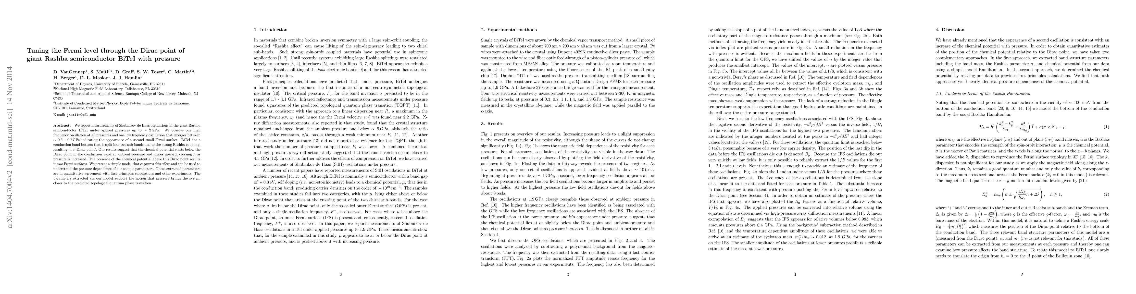 We report measurements of Shubnikov-de Haas oscillations in the giant Rashba semiconductor BiTeI under applied pressures up to $\sim 2\,\mathrm{GPa}$. We observe one high frequency oscillation at all pressures and one low frequency oscillation that emerges between $\sim 0.3-0.7\,\mathrm{GPa}$ indicating the appearance of a second small Fermi surface. BiTeI has a conduction band bottom that is split into two sub-bands due to the strong Rashba coupling, resulting in a `Dirac point'. Our results suggest that the chemical potential starts below the Dirac point in the conduction band at ambient pressure and moves upward, crossing it as pressure is increased. The presence of the chemical potential above this Dirac point results in two Fermi surfaces. We present a simple model that captures this effect and can be used to understand the pressure dependence of our sample parameters. These extracted parameters are in quantitative agreement with first-principles calculations and other experiments. The parameters extracted via our model support the notion that pressure brings the system closer to the predicted topological quantum phase transition.