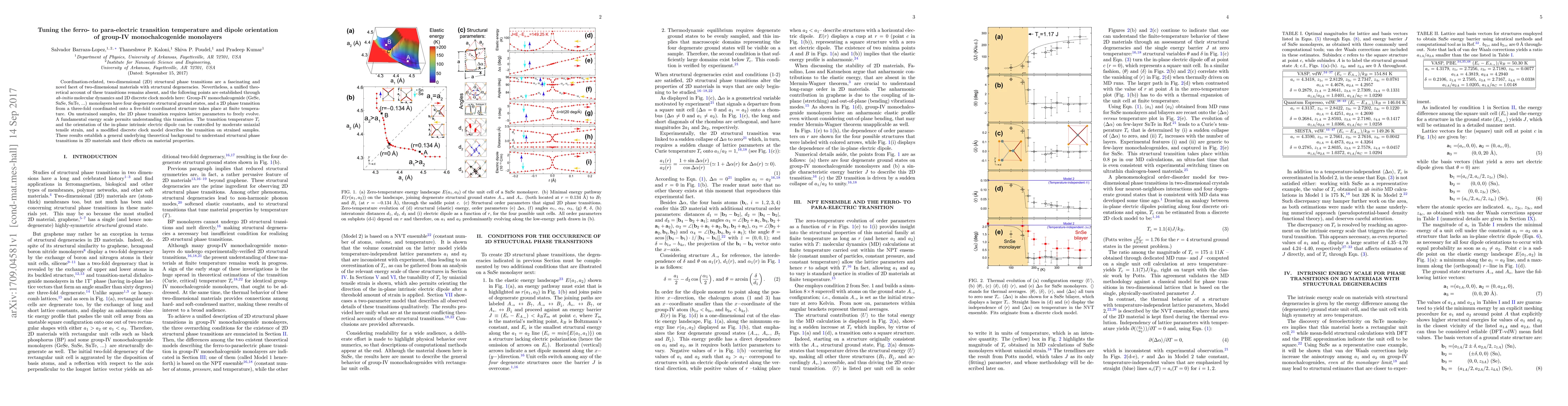 This paper uses {\em ab-initio} molecular dynamics and discrete clock models to investigate structural phase transitions in group-IV monochalcogenide monolayers, demonstrating that these materials exhibit four degenerate ground states and undergo a transition at finite temperature. The transition temperature and dipole orientation can be controlled by moderate tensile strain.