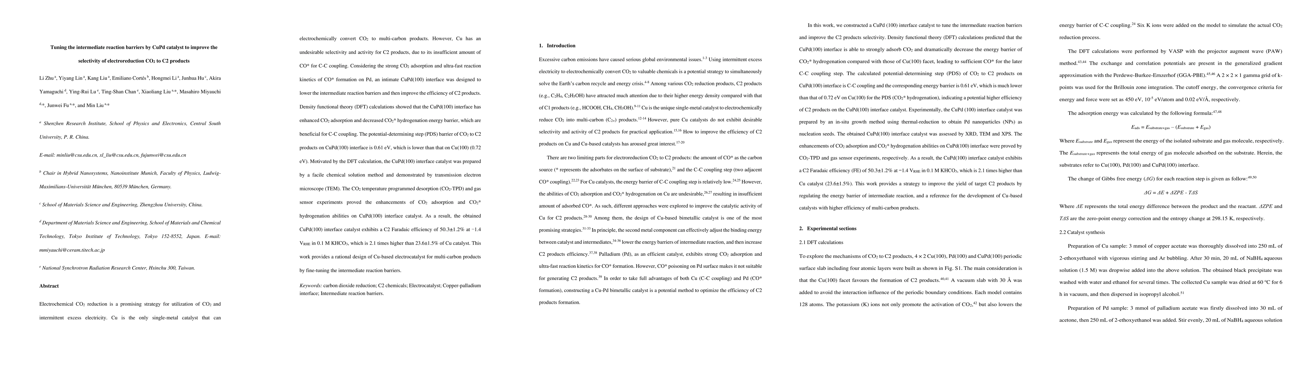 This paper investigates how a CuPd catalyst interface can enhance the electrochemical CO2 reduction to C2 products by lowering intermediate reaction barriers. Density functional theory (DFT) calculations and experimental results show that the CuPd(100) interface improves CO2 adsorption and reduces the energy barrier for C-C coupling, leading to a significant increase in C2 Faradaic efficiency.