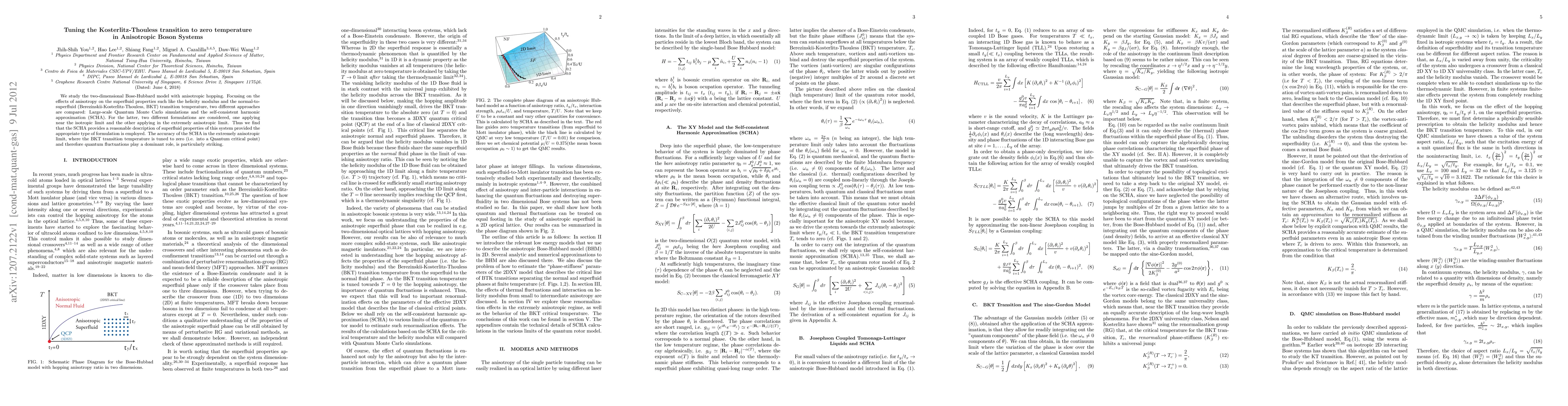We study the two-dimensional Bose-Hubbard model with anisotropic hopping. Focusing on the effects of anisotropy on the superfluid properties such like the helicity modulus and the normal-to-superfluid (Berezinskii-Kosterlitz-Thouless, BKT) transition temperature, two different approaches are compared: Large-scale Quantum Monte Carlo simulations and the self-consistent harmonic approximation (SCHA). For the latter, two different formulations are considered, one applying near the isotropic limit and the other applying in the extremely anisotropic limit. Thus we find that the SCHA provides a reasonable description of superfluid properties of this system provided the appropriate type of formulation is employed. The accuracy of the SCHA in the extremely anisotropic limit, where the BKT transition temperature is tuned to zero (i.e. into a Quantum critical point) and therefore quantum fluctuations play a dominant role, is particularly striking.