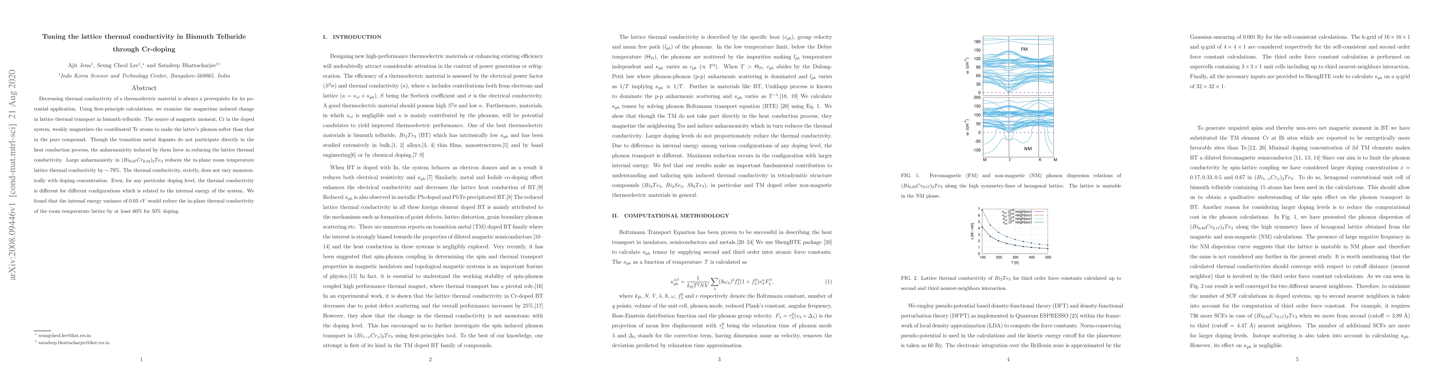 This study investigates how Cr-doping affects the lattice thermal conductivity in bismuth telluride using first-principle calculations. The doping induces magnetism that softens phonons in coordinated Te atoms, leading to significant reductions in thermal conductivity, with a $\sim 79\%$ decrease in $(Bi_{0.67}Cr_{0.33})_2Te_3$ at room temperature.