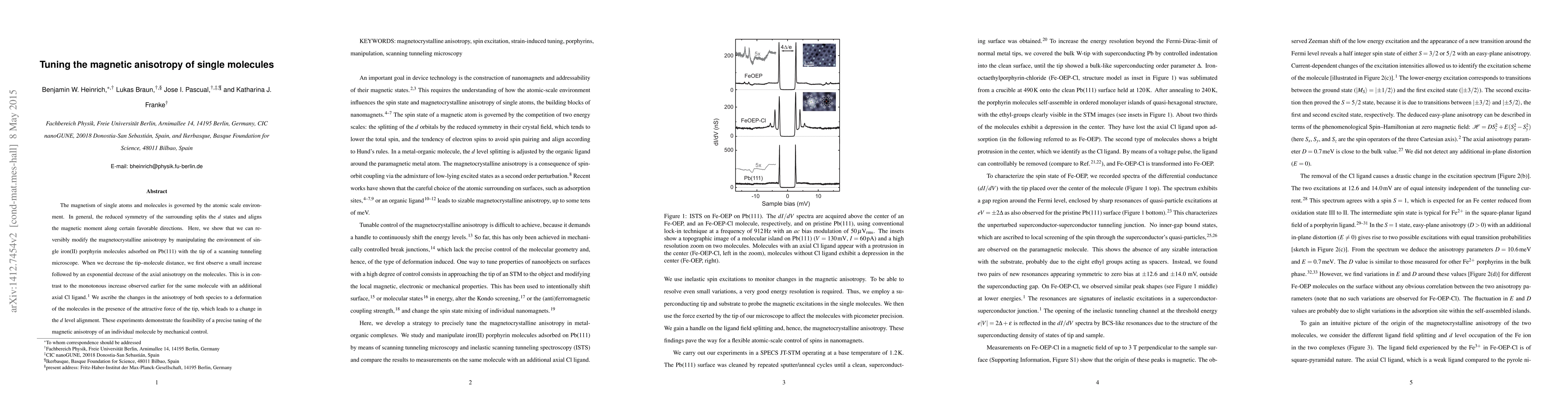 Researchers can reversibly modify the magnetic anisotropy of individual iron(II) porphyrin molecules using a scanning tunneling microscope, allowing for precise tuning of their magnetic properties.