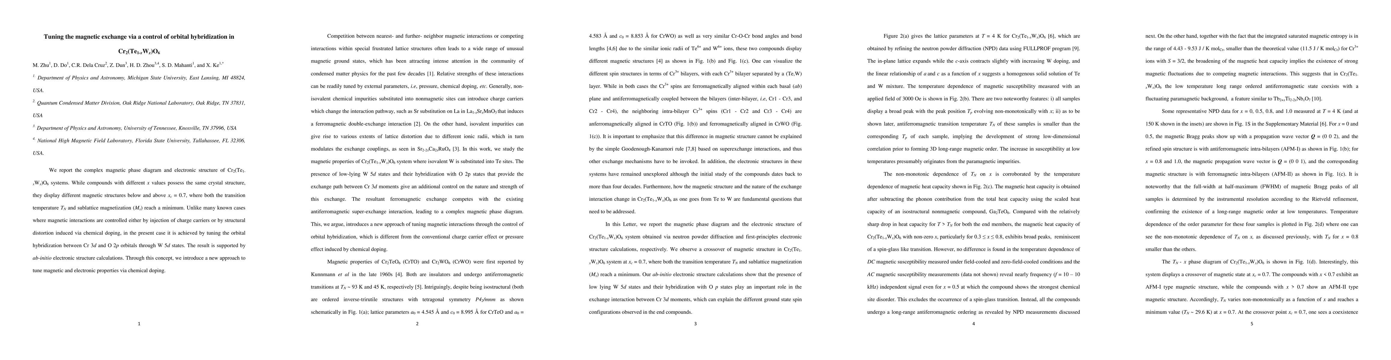 We report the complex magnetic phase diagram and electronic structure of Cr2(Te1-xWx)O6 systems. While compounds with different x values possess the same crystal structure, they display different magnetic structures below and above xc = 0.7, where both the transition temperature TN and sublattice magnetization (Ms) reach a minimum. Unlike many known cases where magnetic interactions are controlled either by injection of charge carriers or by structural distortion induced via chemical doping, in the present case it is achieved by tuning the orbital hybridization between Cr 3d and O 2p orbitals through W 5d states. The result is supported by ab-initio electronic structure calculations. Through this concept, we introduce a new approach to tune magnetic and electronic properties via chemical doping.