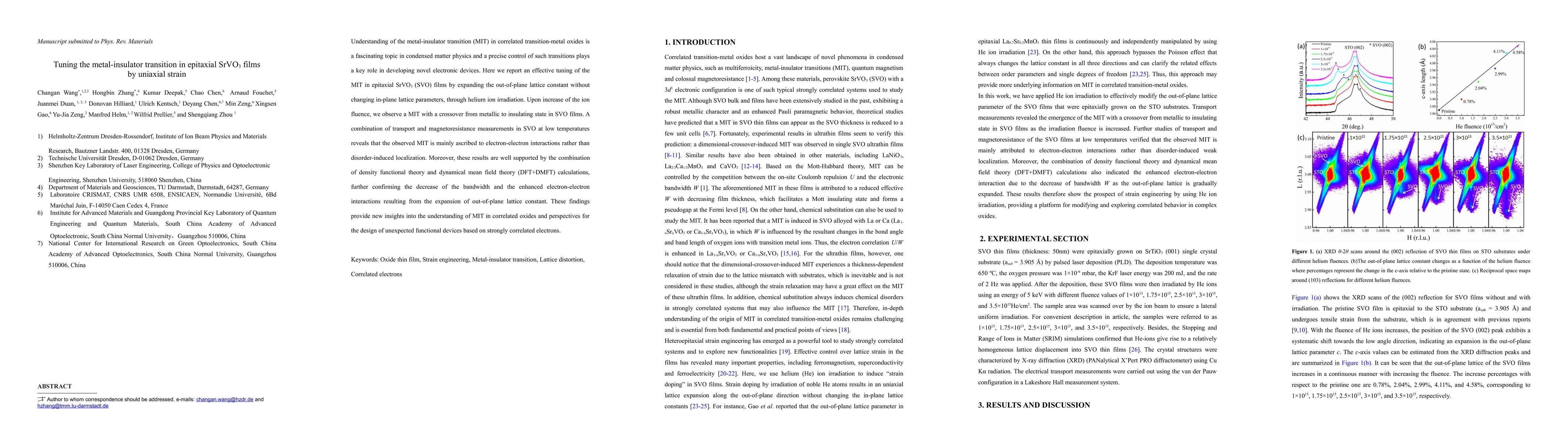 Understanding of the metal-insulator transition (MIT) in correlated transition-metal oxides is a fascinating topic in condensed matter physics and a precise control of such transitions plays a key role in developing novel electronic devices. Here we report an effective tuning of the MIT in epitaxial SrVO3 (SVO) films by expanding the out-of-plane lattice constant without changing in-plane lattice parameters, through helium ion irradiation. Upon increase of the ion fluence, we observe a MIT with a crossover from metallic to insulating state in SVO films. A combination of transport and magnetoresistance measurements in SVO at low temperatures reveals that the observed MIT is mainly ascribed to electron-electron interactions rather than disorder-induced localization. Moreover, these results are well supported by the combination of density functional theory and dynamical mean field theory (DFT+DMFT) calculations, further confirming the decrease of the bandwidth and the enhanced electron-electron interactions resulting from the expansion of out-of-plane lattice constant. These findings provide new insights into the understanding of MIT in correlated oxides and perspectives for the design of unexpected functional devices based on strongly correlated electrons.