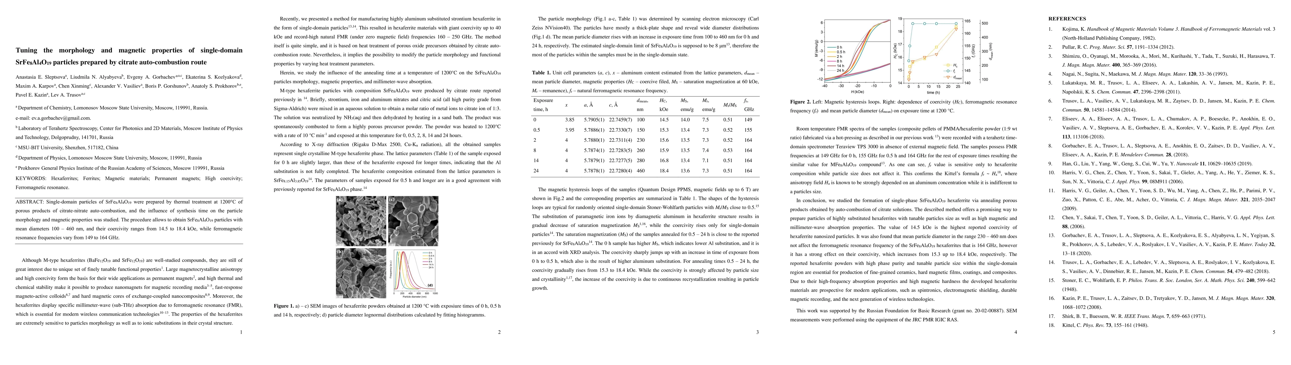This study investigates the synthesis of single-domain SrFe8Al4O19 particles via citrate auto-combustion, finding that varying synthesis time alters particle morphology and magnetic properties, with coercivity ranging from 14.5 to 18.4 kOe and ferromagnetic resonance frequencies from 149 to 164 GHz.