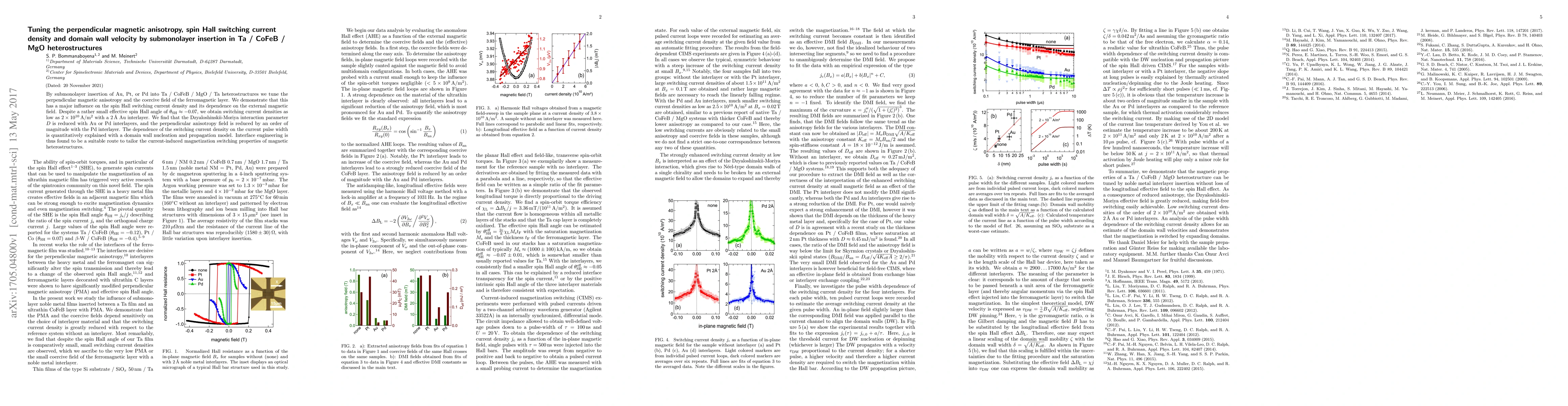 This paper investigates how submonolayer insertion of Au, Pt, or Pd into Ta/CoFeB/MgO heterostructures tunes perpendicular magnetic anisotropy and coercive field, significantly affecting spin Hall switching current density and domain wall velocity. The study finds low switching current densities of $2 \times 10^{10}$ A/m$^2$ with a 2 Å Au interlayer, demonstrating the effectiveness of interface engineering in optimizing magnetic heterostructures.