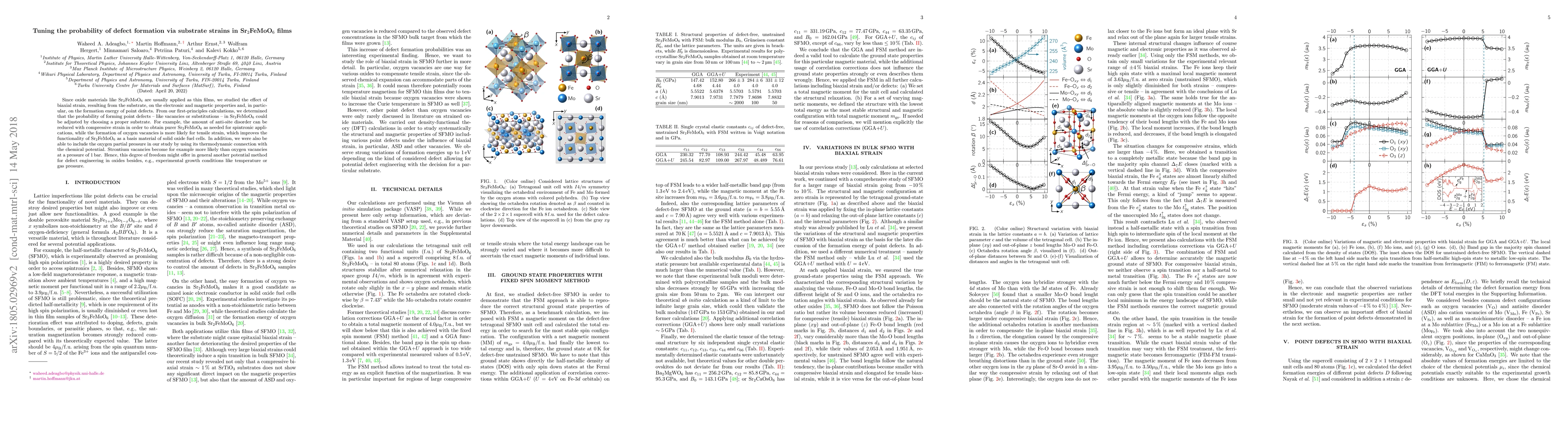 Since oxide materials like Sr$_2$FeMoO$_6$ are usually applied as thin films, we studied the effect of biaxial strain, resulting from the substrate, on the electronic and magnetic properties and, in particular, on the formation energy of point defects. From our first-principles calculations, we determined that the probability of forming point defects - like vacancies or substitutions - in Sr$_2$FeMoO$_6$ could be adjusted by choosing a proper substrate. For example, the amount of anti-site disorder can be reduced with compressive strain in order to obtain purer Sr$_2$FeMoO$_6$ as needed for spintronic applications, while the formation of oxygen vacancies is more likely for tensile strain, which improves the functionality of Sr$_2$FeMoO$_6$ as a basis material of solid oxide fuel cells. In addition, we were also be able to include the oxygen partial pressure in our study by using its thermodynamic connection with the chemical potential. Strontium vacancies become for example more likely than oxygen vacancies at a pressure of 1$\,$bar. Hence, this degree of freedom might offer in general another potential method for defect engineering in oxides besides, e.g., experimental growth conditions like temperature or gas pressure.