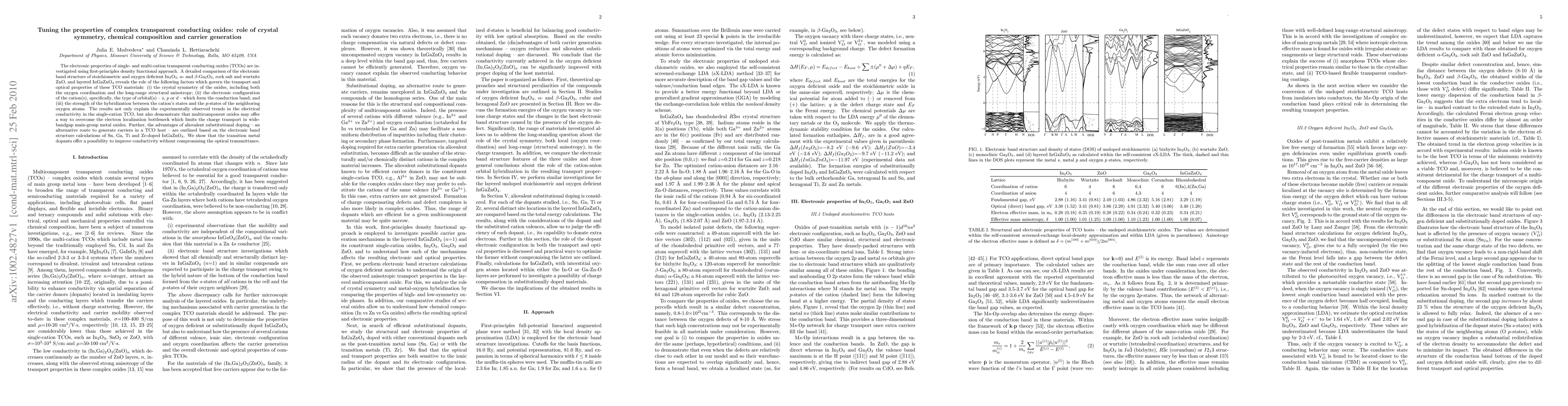 This paper investigates the electronic properties of transparent conducting oxides (TCOs) using density functional theory, focusing on how crystal symmetry, chemical composition, and carrier generation influence their transport and optical properties. The study reveals that multicomponent oxides can enhance conductivity and suggests that transition metal dopants can improve conductivity without sacrificing optical transmittance.