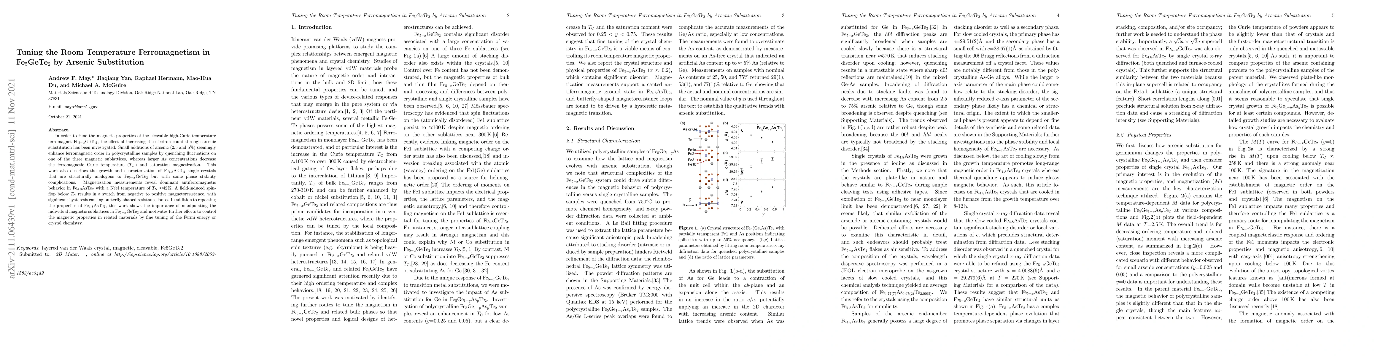 In order to tune the magnetic properties of the cleavable high-Curie temperature ferromagnet Fe$_{5-x}$GeTe$_2$, the effect of increasing the electron count through arsenic substitution has been investigated. Small additions of arsenic (2.5 and 5%) seemingly enhance ferromagnetic order in polycrystalline samples by quenching fluctuations on one of the three magnetic sublattices, whereas larger As concentrations decrease the ferromagnetic Curie temperature ($T_{\rm C}$) and saturation magnetization. This work also describes the growth and characterization of Fe$_{4.8}$AsTe$_2$ single crystals that are structurally analogous to Fe$_{5-x}$GeTe$_2$ but with some phase stability complications. Magnetization measurements reveal dominant antiferromagnetic behavior in Fe$_{4.8}$AsTe$_2$ with a N\'{e}el temperature of $T_{\rm N}$ $\approx$42K. A field-induced spin-flop below $T_{\rm N}$ results in a switch from negative to positive magnetoresistance, with significant hysteresis causing butterfly-shaped resistance loops. In addition to reporting the properties of Fe$_{4.8}$AsTe$_2$, this work shows the importance of manipulating the individual magnetic sublattices in Fe$_{5-x}$GeTe$_2$ and motivates further efforts to control the magnetic properties in related materials by fine tuning of the Fermi energy or crystal chemistry.