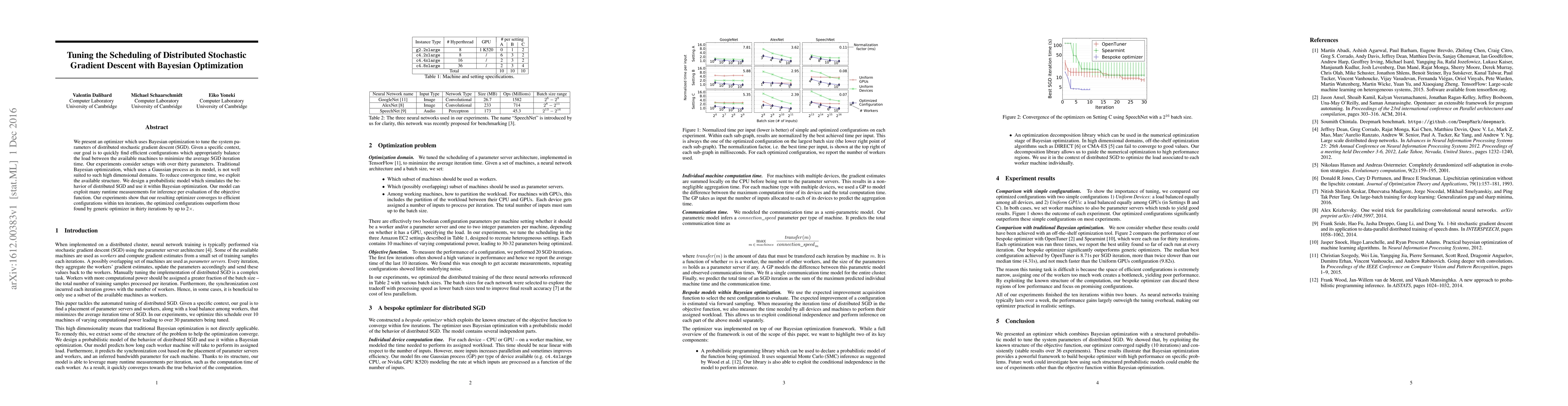 This paper proposes an optimizer using Bayesian optimization to tune the parameters of distributed stochastic gradient descent (SGD), focusing on balancing load and minimizing iteration time. The authors develop a probabilistic model to efficiently navigate high-dimensional parameter spaces and demonstrate that their approach converges to optimal configurations faster than traditional methods.