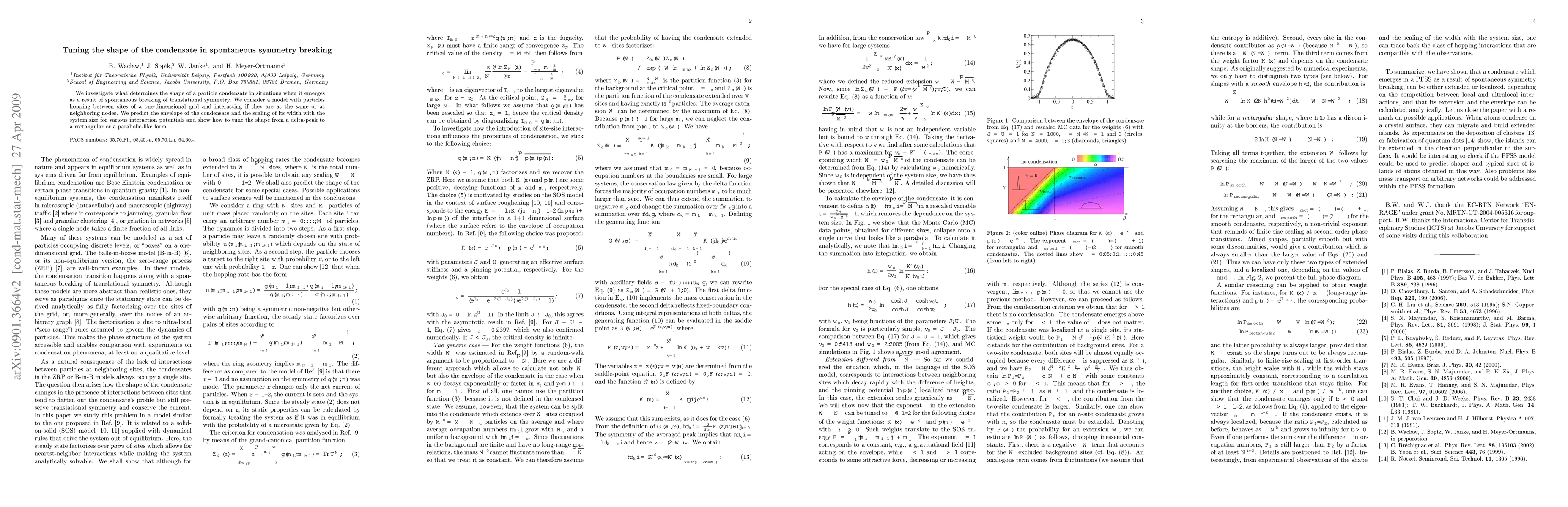 We investigate what determines the shape of a particle condensate in situations when it emerges as a result of spontaneous breaking of translational symmetry. We consider a model with particles hopping between sites of a one-dimensional grid and interacting if they are at the same or at neighboring nodes. We predict the envelope of the condensate and the scaling of its width with the system size for various interaction potentials and show how to tune the shape from a delta-peak to a rectangular or a parabolic-like form.