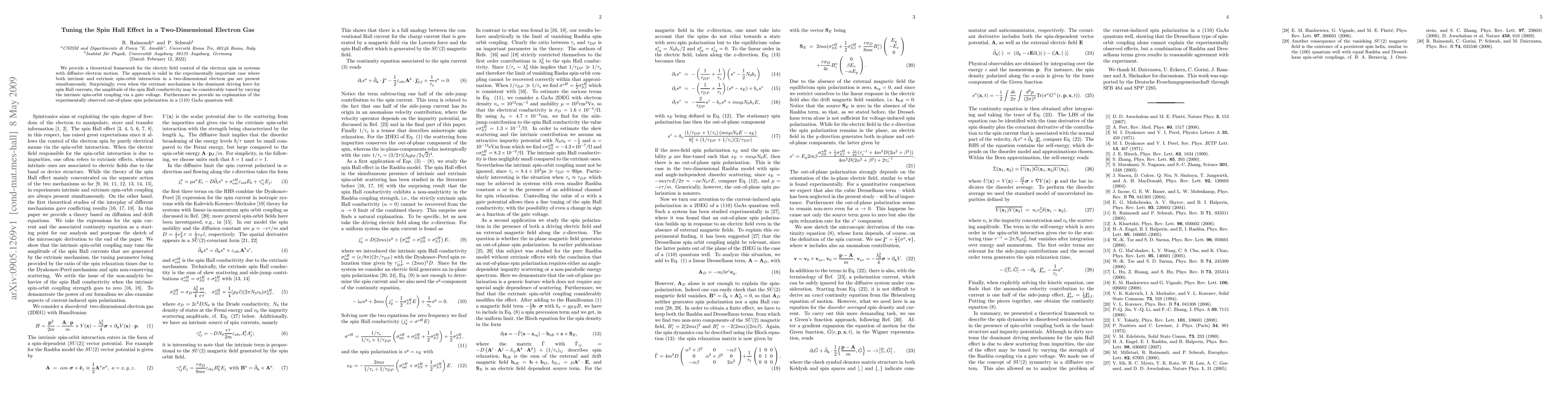 We provide a theoretical framework for the electric field control of the electron spin in systems with diffusive electron motion. The approach is valid in the experimentally important case where both intrinsic and extrinsic spin-orbit interaction in a two-dimensional electron gas are present simultaneously. Surprisingly, even when the extrinsic mechanism is the dominant driving force for spin Hall currents, the amplitude of the spin Hall conductivity may be considerably tuned by varying the intrinsic spin-orbit coupling via a gate voltage. Furthermore we provide an explanation of the experimentally observed out-of-plane spin polarization in a (110) GaAs quantum well.