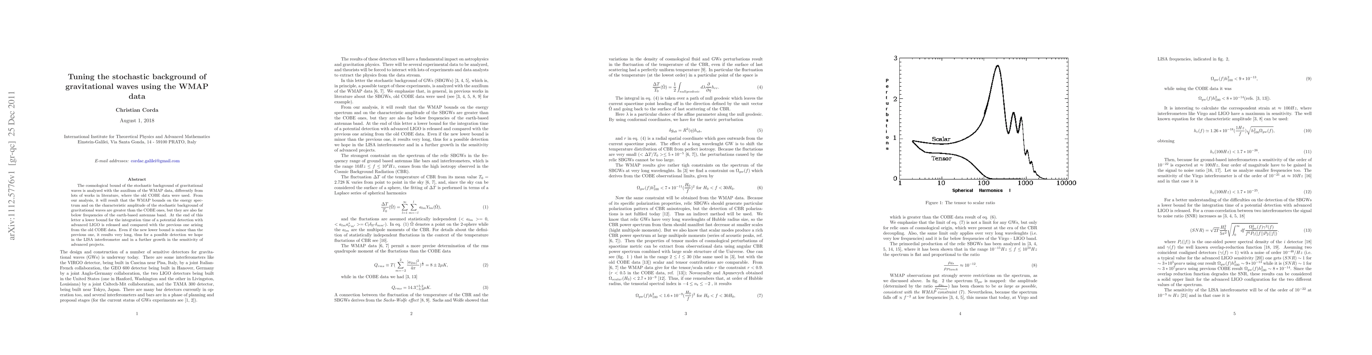 This paper analyzes the stochastic background of gravitational waves using WMAP data, finding that WMAP provides stronger bounds than COBE but remains below detectable frequencies for earth-based antennas. The study also proposes a longer integration time for potential detections with advanced LIGO, suggesting future improvements in sensitivity and the LISA interferometer may be necessary.