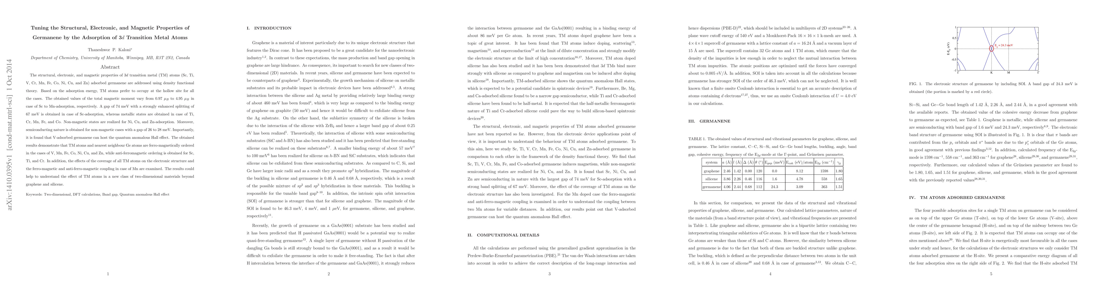 This paper explores how adsorption of 3$d$ transition metal atoms onto germanene alters its structural, electronic, and magnetic properties using density functional theory. The study finds that TM atoms induce diverse magnetic moments and electronic states, including semiconducting and metallic behaviors, and highlight the potential for quantum anomalous Hall effects in V-adsorbed germanene.