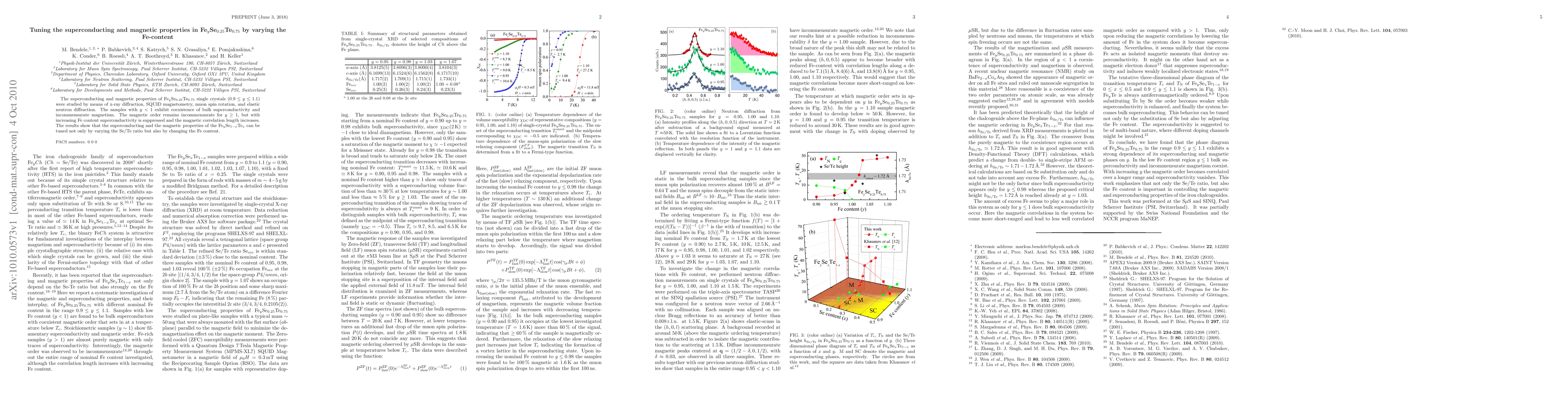The superconducting and magnetic properties of Fe$_{y}$Se$_{0.25}$Te$_{0.75}$ single crystals ($0.9\leq y \leq1.1$) were studied by means of x-ray diffraction, SQUID magnetometry, muon spin rotation, and elastic neutron diffraction. The samples with $y<1$ exhibit coexistence of bulk superconductivity and incommensurate magnetism. The magnetic order remains incommensurate for $y\geq 1$, but with increasing Fe content superconductivity is suppressed and the magnetic correlation length increases. The results show that the superconducting and the magnetic properties of the Fe$_{y}$Se$_{1-x}$Te$_{x}$ can be tuned not only by varying the Se/Te ratio but also by changing the Fe content.