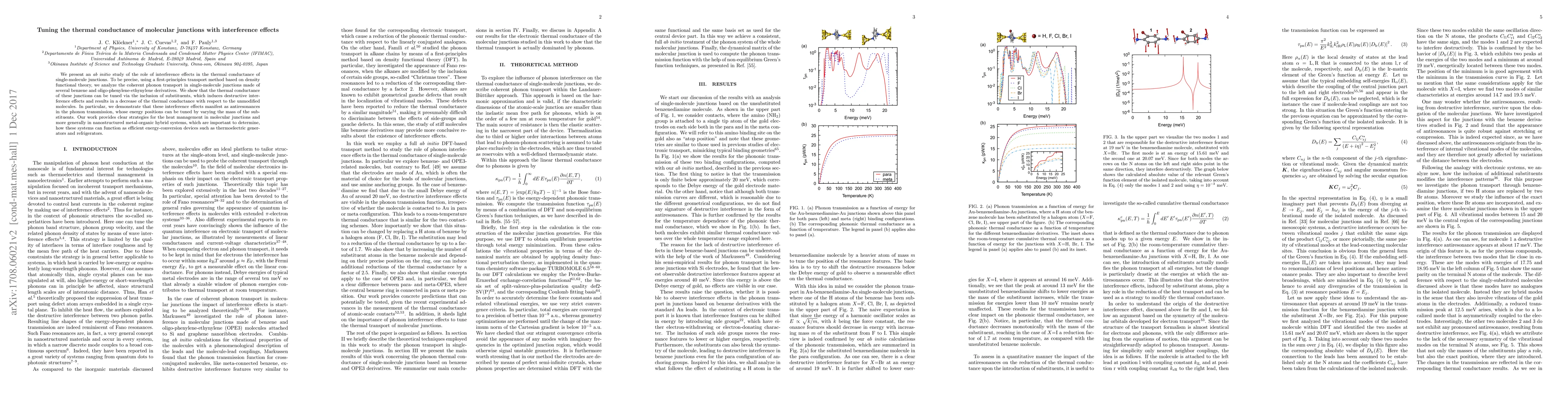 This paper investigates how interference effects can modulate the thermal conductance of single-molecule junctions using \emph{ab initio} methods based on density functional theory. The study finds that substituents induce destructive interference, leading to decreased thermal conductance and observable antiresonances in phonon transmission, which can be controlled by substituent mass, offering strategies for efficient heat management in nanostructured metal-organic systems.