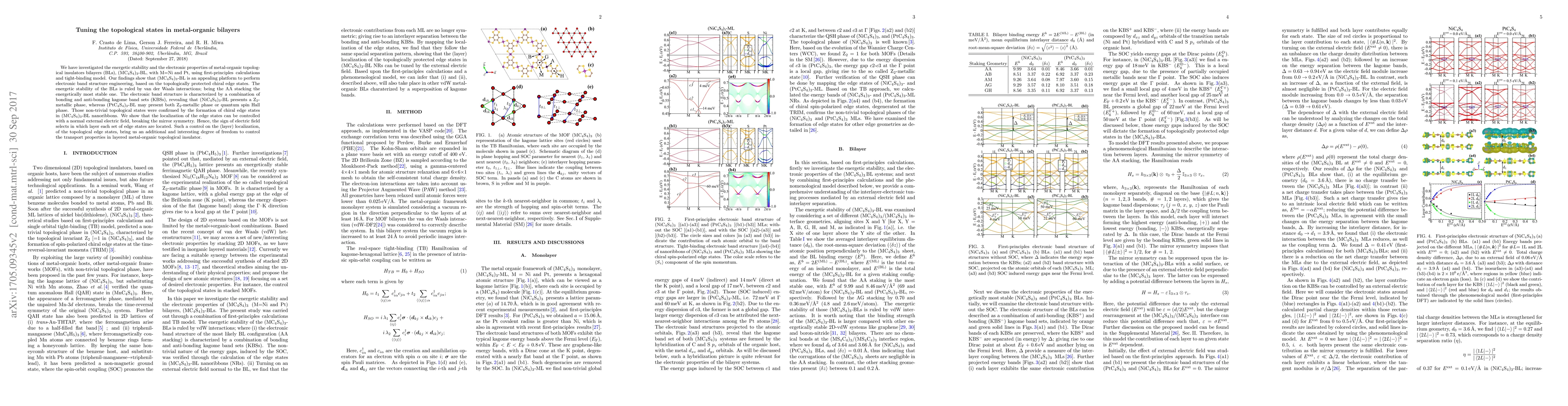 We have investigated the energetic stability and the electronic properties of metal-organic topological insulators bilayers (BLs), $(MC_4S_4)_3$-BL, with M=Ni and Pt, using first-principles calculations and tight-binding model. Our findings show that $(MC_4S_4)_3$-BL is an appealing platform to perform electronic band structure engineering, based on the topologically protected chiral edge states. The energetic stability of the BLs is ruled by van der Waals interactions; being the AA stacking the energetically most stable one. The electronic band structure is characterized by a combination of bonding and anti-bonding kagome band sets (KBSs), revealing that $(NiC_4S_4)_3$-BL presents a Z$_2$-metallic phase, whereas $(PtC_4S_4)_3$-BL may present both Z$_2$-metallic phase or quantum spin Hall phase. Those non-trivial topological states were confirmed by the formation of chiral edge states in $(MC_4S_4)_3$-BL nanoribbons. We show that the localization of the edge states can be controlled with a normal external electric field, breaking the mirror symmetry. Hence, the sign of electric field selects in which layer each set of edge states are located. Such a control on the (layer) localization, of the topological edge states, bring us an additional and interesting degree of freedom to control the transport properties in layered metal-organic topological insulator.