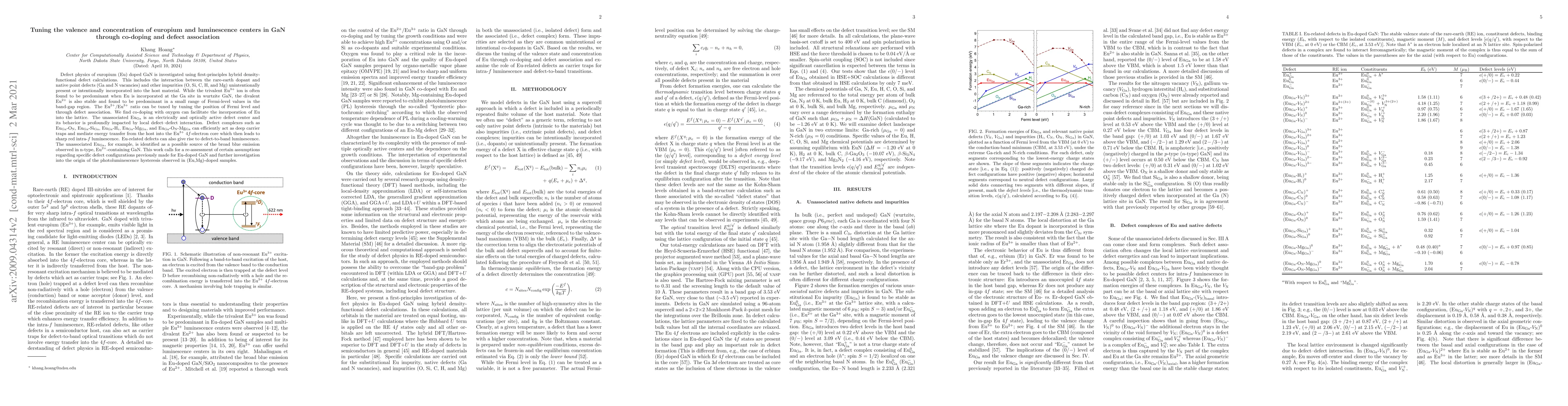 This study investigates the defect physics of europium-doped GaN using first-principles calculations, revealing that the Eu$^{2+}$/Eu$^{3+}$ ratio can be tuned by adjusting the Fermi level and through defect association. Co-doping with oxygen facilitates Eu incorporation, and defect complexes mediate energy transfer leading to sharp red luminescence and broad blue emission.
