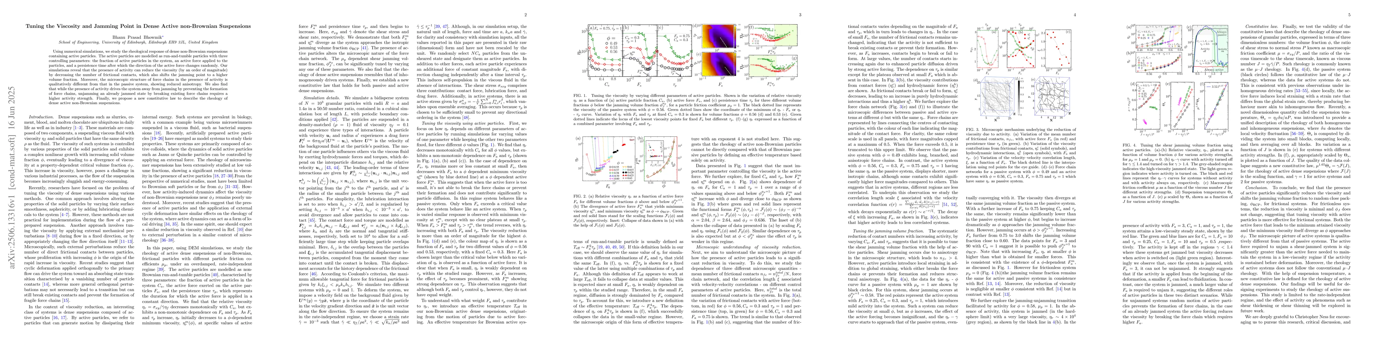 The novelty of this work lies in its comprehensive numerical simulation study of active non-Brownian suspensions, revealing how active forces and persistence times affect viscosity and jamming points, and proposing a novel constitutive law for such systems.