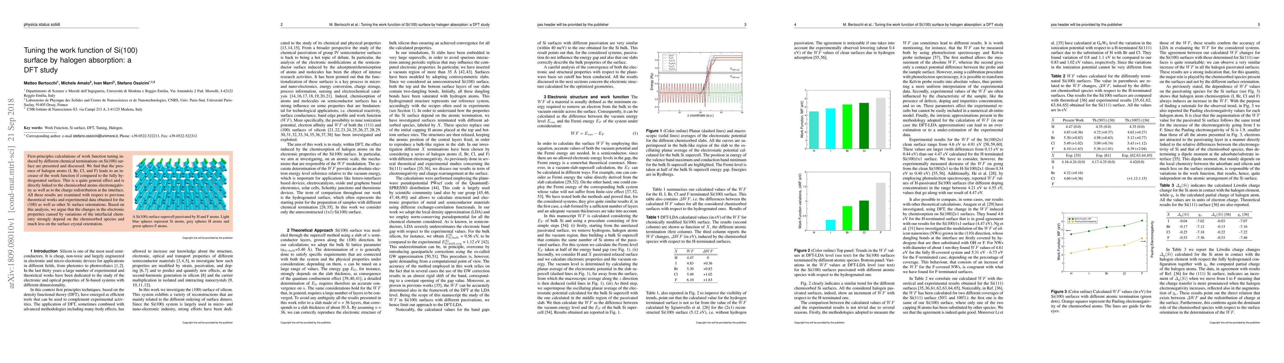 First-principles calculations of work function tuning induced by different chemical terminations on Si(100) surface are presented and discussed. We find that the presence of halogen atoms (I, Br, Cl, and F) leads to an increase of the work function if compared to the fully hydrogenated surface. This is a quite general effect and is directly linked to the chemisorbed atoms electronegativity as well as to the charge redistribution at the interface. All these results are examined with respect to previous theoretical works and experimental data obtained for the (100) as well as other Si surface orientations. Based on this analysis, we argue that the changes in the electronic properties caused by variations of the interfacial chemistry strongly depend on the chemisorbed species and much less on the surface crystal orientation.