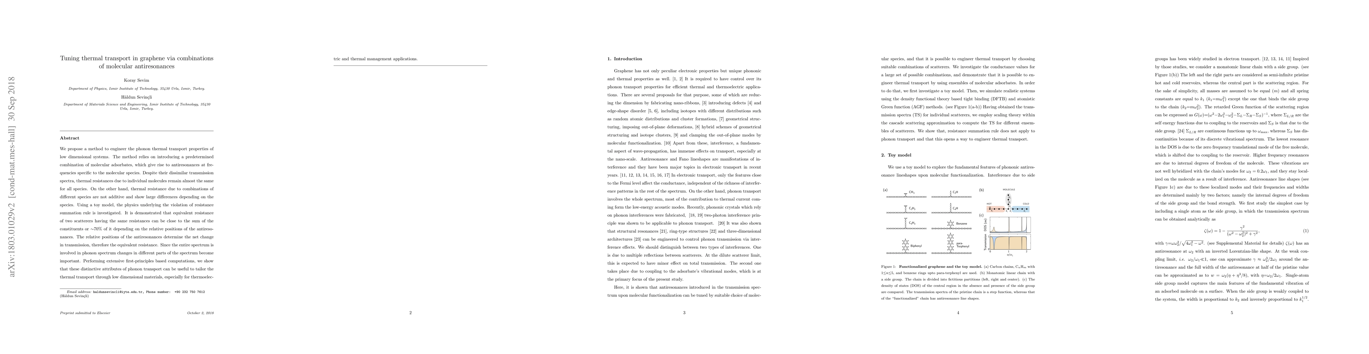 We propose a method to engineer the phonon thermal transport properties of low dimensional systems. The method relies on introducing a predetermined combination of molecular adsorbates, which give rise to antiresonances at frequencies specific to the molecular species. Despite their dissimilar transmission spectra, thermal resistances due to individual molecules remain almost the same for all species. On the other hand, thermal resistance due to combinations of different species are not additive and show large differences depending on the species. Using a toy model, the physics underlying the violation of resistance summation rule is investigated. It is demonstrated that equivalent resistance of two scatterers having the same resistances can be close to the sum of the constituents or $\sim$70\% of it depending on the relative positions of the antiresonances. The relative positions of the antiresonances determine the net change in transmission, therefore the equivalent resistance. Since the entire spectrum is involved in phonon spectrum changes in different parts of the spectrum become important. Performing extensive first-principles based computations, we show that these distinctive attributes of phonon transport can be useful to tailor the thermal transport through low dimensional materials, especially for thermoelectric and thermal management applications.