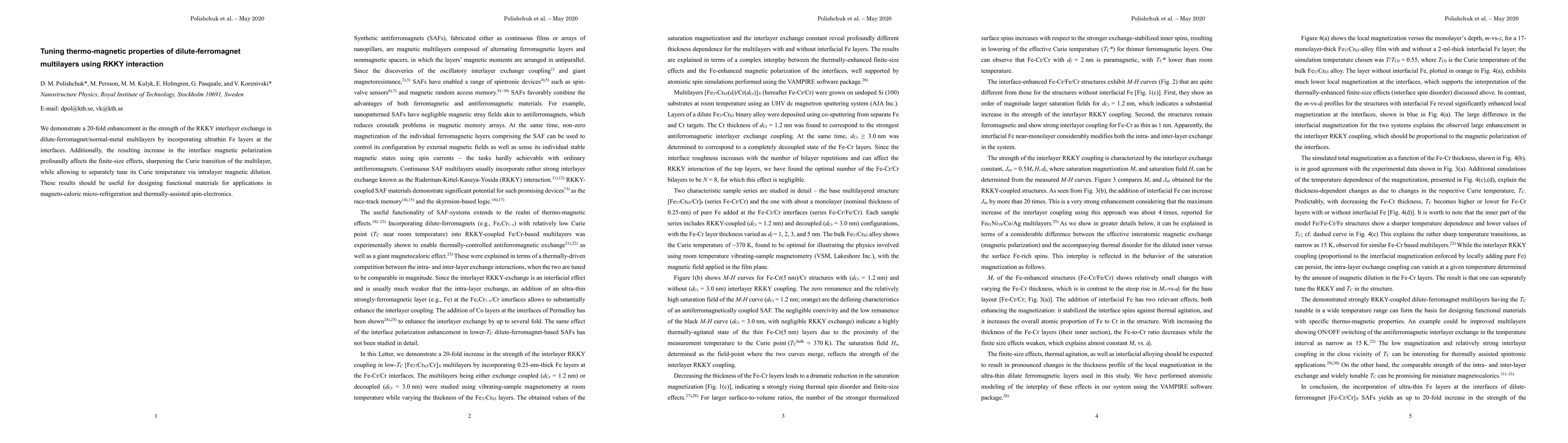 This study enhances the RKKY interlayer exchange in dilute-ferromagnet/normal-metal multilayers by inserting ultrathin Fe layers, achieving a 20-fold increase in strength. The improved interface magnetic polarization sharpens the Curie transition and allows independent tuning of the Curie temperature, promising applications in magneto-caloric refrigeration and spin-electronics.
