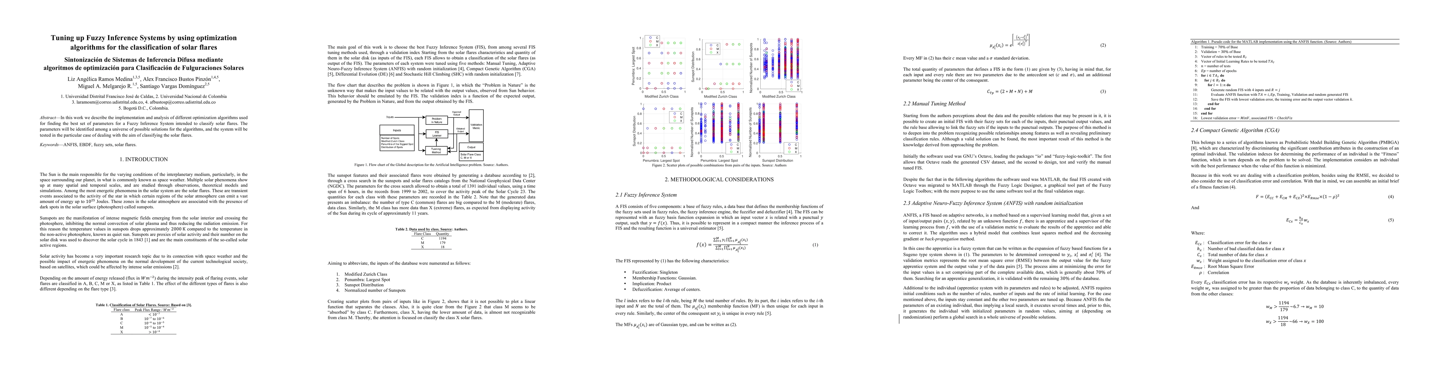 In this work we describe the implementation and analysis of different optimization algorithms used for finding the best set of parameters for a Fuzzy Inference System intended to classify solar flares. The parameters will be identified among a universe of possible solutions for the algorithms, and the system will be tested in the particular case of dealing with the aim of classifying the solar flares.