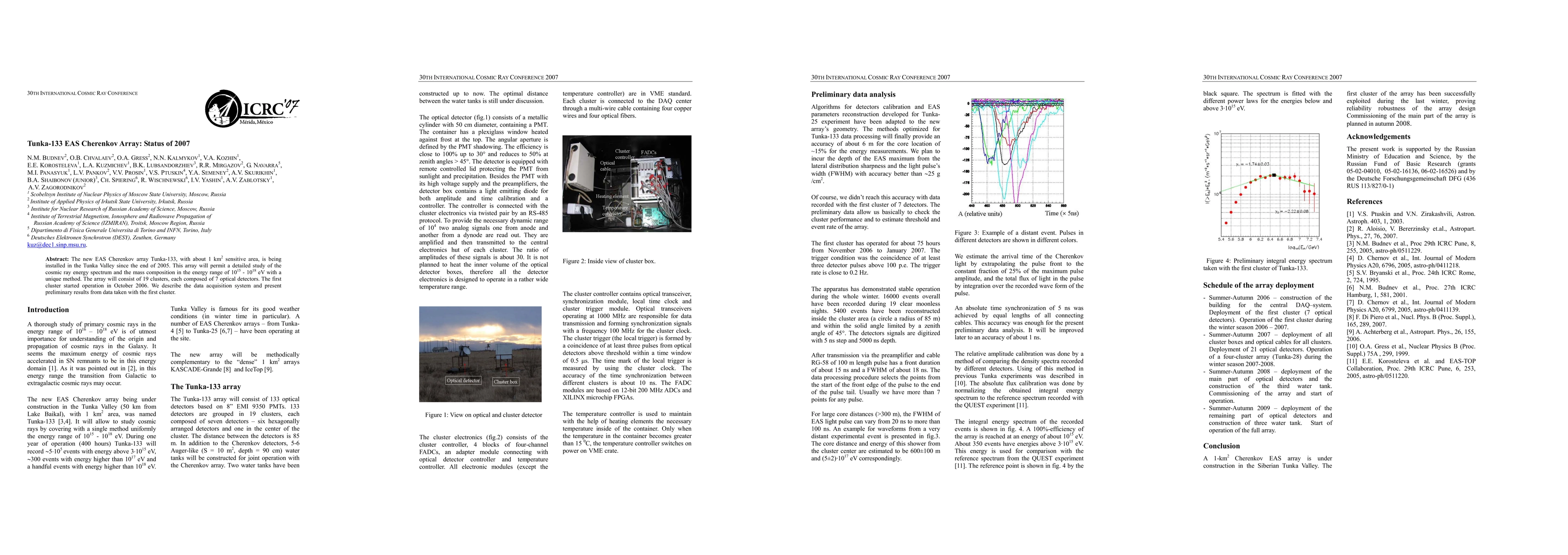 The Tunka-133 EAS Cherenkov Array is being installed to study cosmic rays in the 10^15-10^18 eV range with unprecedented detail. Preliminary results from its first cluster show promising data acquisition system and initial findings.