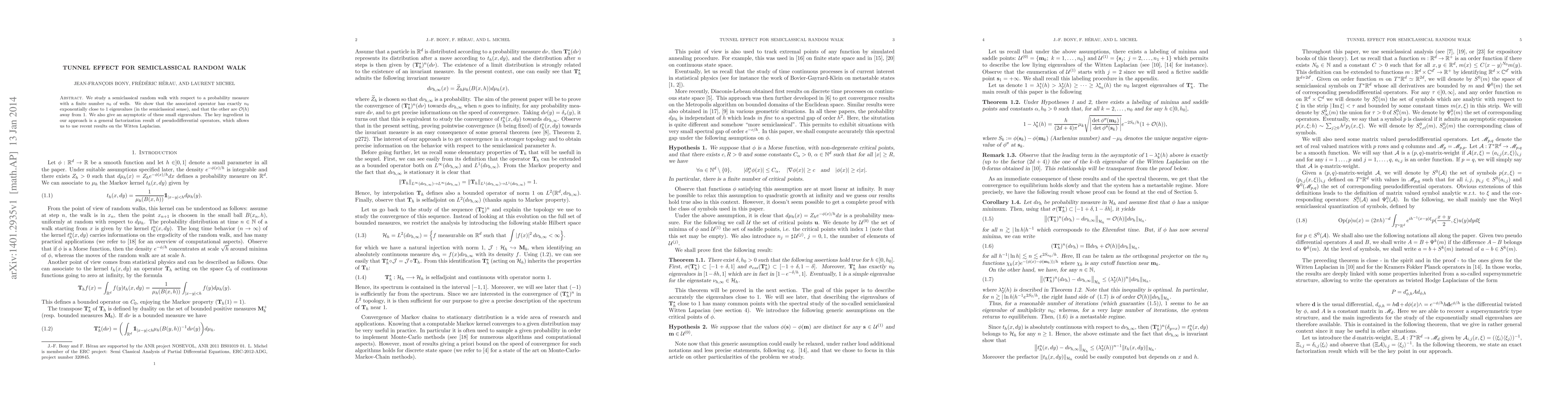 We study a semiclassical random walk with respect to a probability measure with a finite number n_0 of wells. We show that the associated operator has exactly n_0 exponentially close to 1 eigenvalues (in the semiclassical sense), and that the other are O(h) away from 1. We also give an asymptotic of these small eigenvalues. The key ingredient in our approach is a general factorization result of pseudodifferential operators, which allows us to use recent results on the Witten Laplacian.