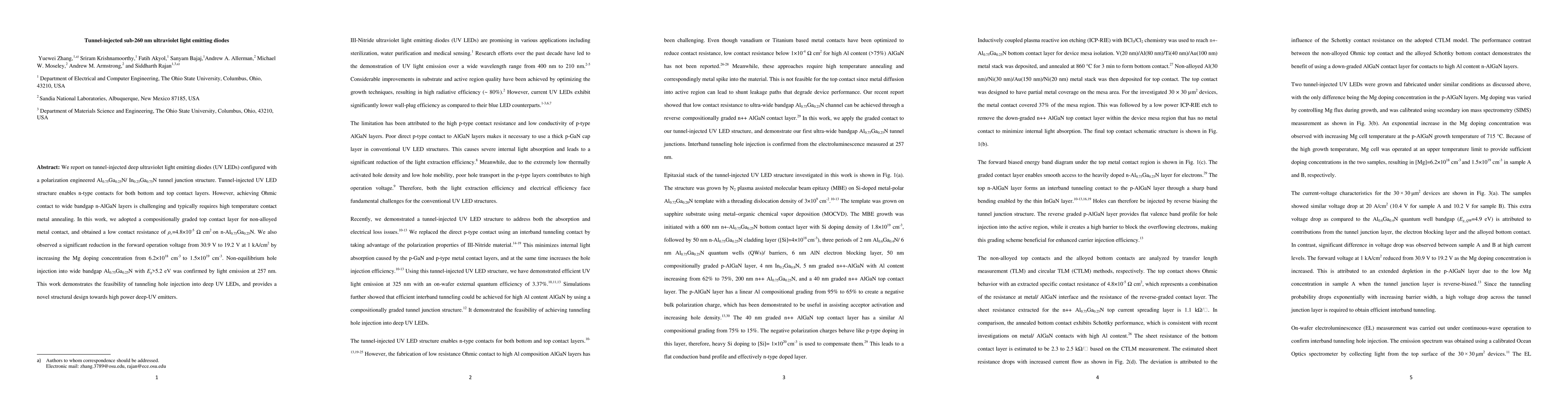 This paper reports on the development of tunnel-injected deep ultraviolet LEDs with a polarization-engineered Al0.75Ga0.25N/In0.2Ga0.8N tunnel junction, achieving a significant reduction in forward operation voltage and demonstrating non-equilibrium hole injection at 257 nm.
