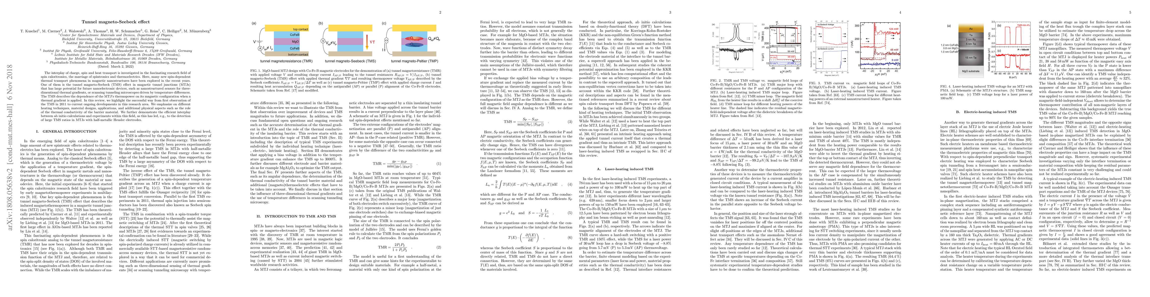 This paper reviews the tunnel magneto-Seebeck (TMS) effect in magnetic tunnel junctions, highlighting its observation, development, and applications in spin caloritronics. It emphasizes material designs, heating techniques, and the interplay between theoretical and experimental research, showcasing its potential in nanoelectronics.