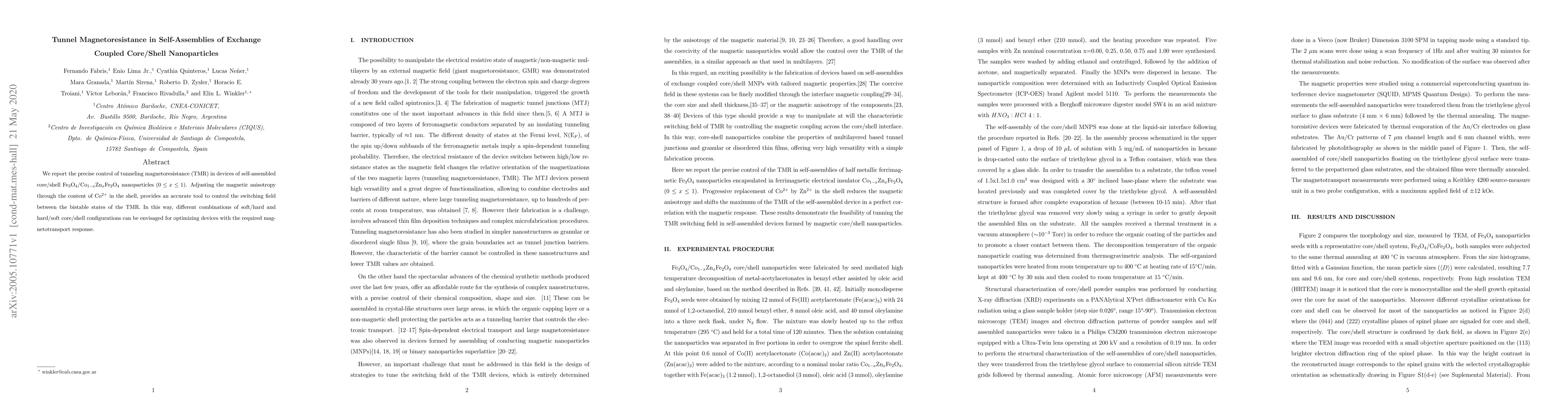 This paper investigates the precise control of tunneling magnetoresistance (TMR) in self-assembled core/shell Fe$_3$O$_4$/Co$_{1-x}$Zn$_x$Fe$_2$O$_4$ nanoparticles, demonstrating how varying the Co$^{2+}$ content adjusts the magnetic anisotropy and switching field between TMR states, enabling optimized magnetotransport devices.