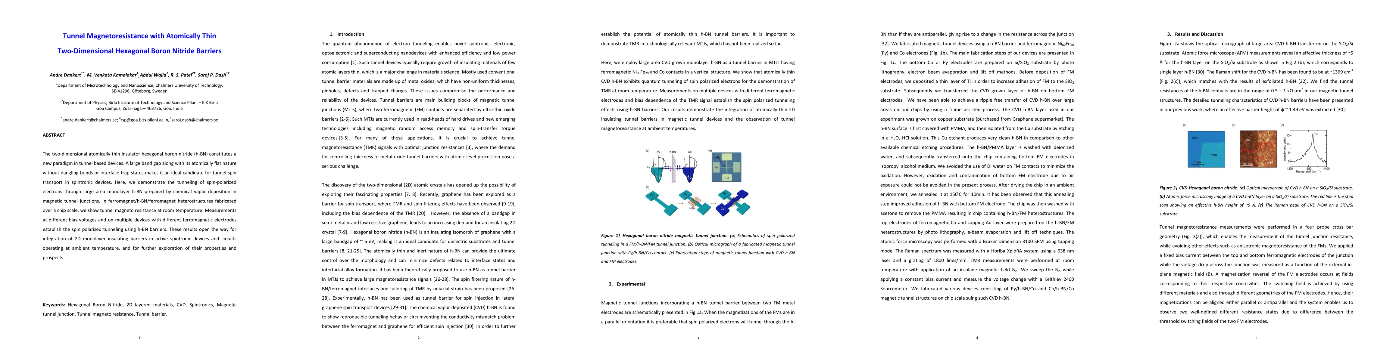This paper demonstrates the use of atomically thin hexagonal boron nitride (h-BN) as an insulating barrier in magnetic tunnel junctions, showing tunnel magnetoresistance at room temperature. The results suggest potential for integrating 2D h-BN barriers in spintronic devices operating at ambient conditions.