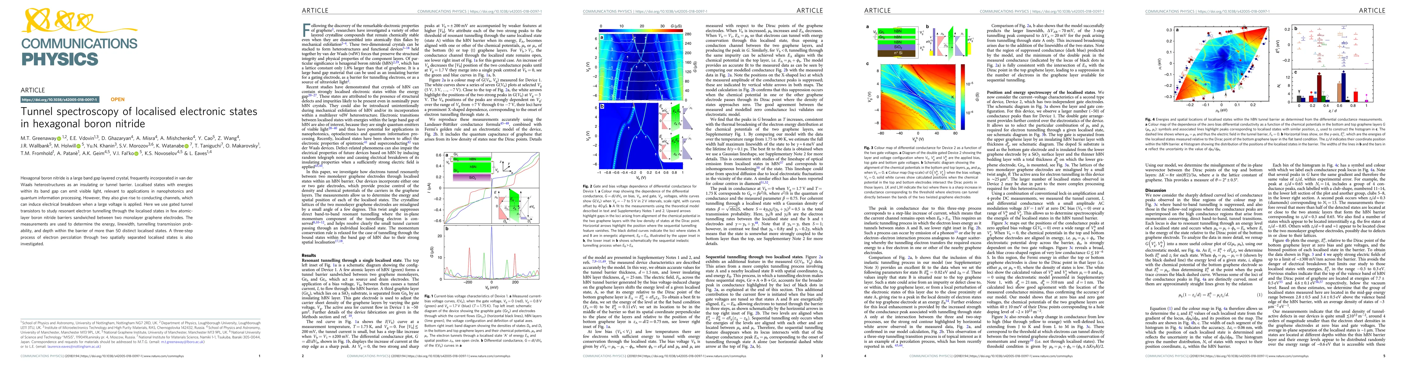 This paper investigates localised electronic states in hexagonal boron nitride (hBN) using gated tunnel transistors, determining their energy, linewidth, and tunnelling properties, and explores electron percolation through multiple localised states. The findings are crucial for understanding hBN's role in nanophotonics and quantum information technologies.