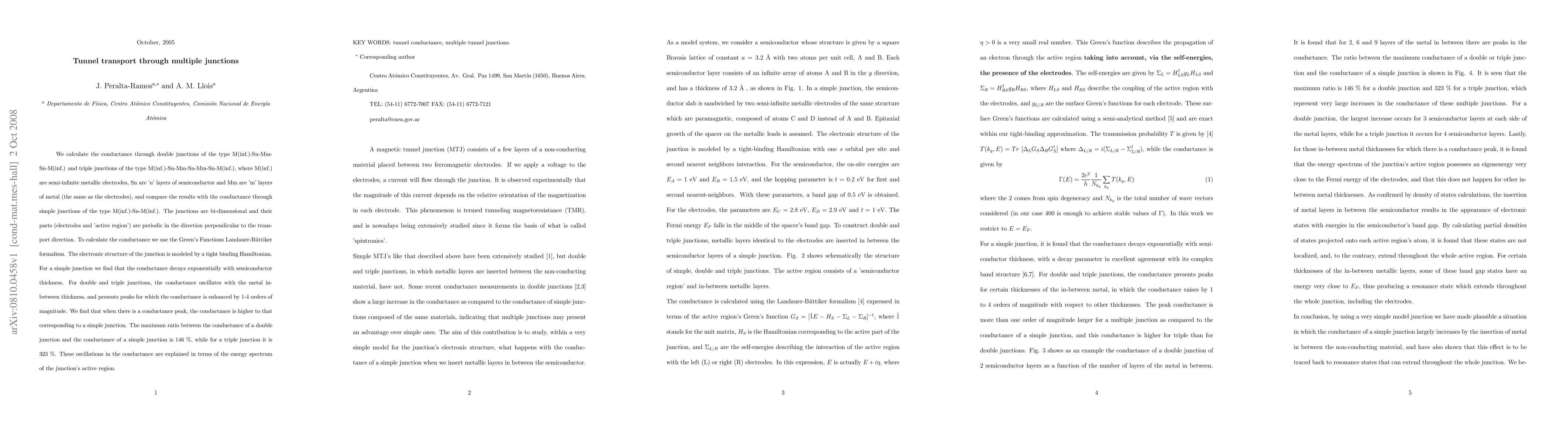 We calculate the conductance through double junctions of the type M(inf.)-Sn-Mm-Sn-M(inf.) and triple junctions of the type M(inf.)-Sn-Mm-Sn-Mm-Sn-M(inf.), where M(inf.) are semi-infinite metallic electrodes, Sn are 'n' layers of semiconductor and Mm are 'm' layers of metal (the same as the electrodes), and compare the results with the conductance through simple junctions of the type M(inf.)-Sn-M(inf.). The junctions are bi-dimensional and their parts (electrodes and 'active region') are periodic in the direction perpendicular to the transport direction. To calculate the conductance we use the Green's Functions Landauer-B$\ddot{u}$ttiker formalism. The electronic structure of the junction is modeled by a tight binding Hamiltonian. For a simple junction we find that the conductance decays exponentially with semiconductor thickness. For double and triple junctions, the conductance oscillates with the metal in-between thickness, and presents peaks for which the conductance is enhanced by 1-4 orders of magnitude. We find that when there is a conductance peak, the conductance is higher to that corresponding to a simple junction. The maximum ratio between the conductance of a double junction and the conductance of a simple junction is 146 %, while for a triple junction it is 323 %. These oscillations in the conductance are explained in terms of the energy spectrum of the junction's active region.