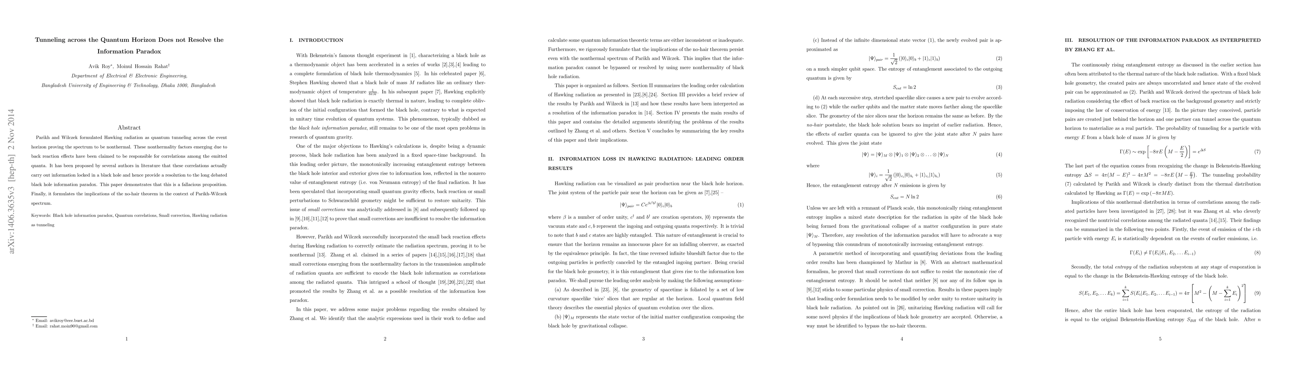 This paper argues that quantum tunneling across the event horizon, as proposed by Parikh and Wilczek, does not resolve the black hole information paradox, refuting claims that nonthermal Hawking radiation correlations carry the information thought to be lost in black holes. It also discusses the implications for the no-hair theorem in this context.