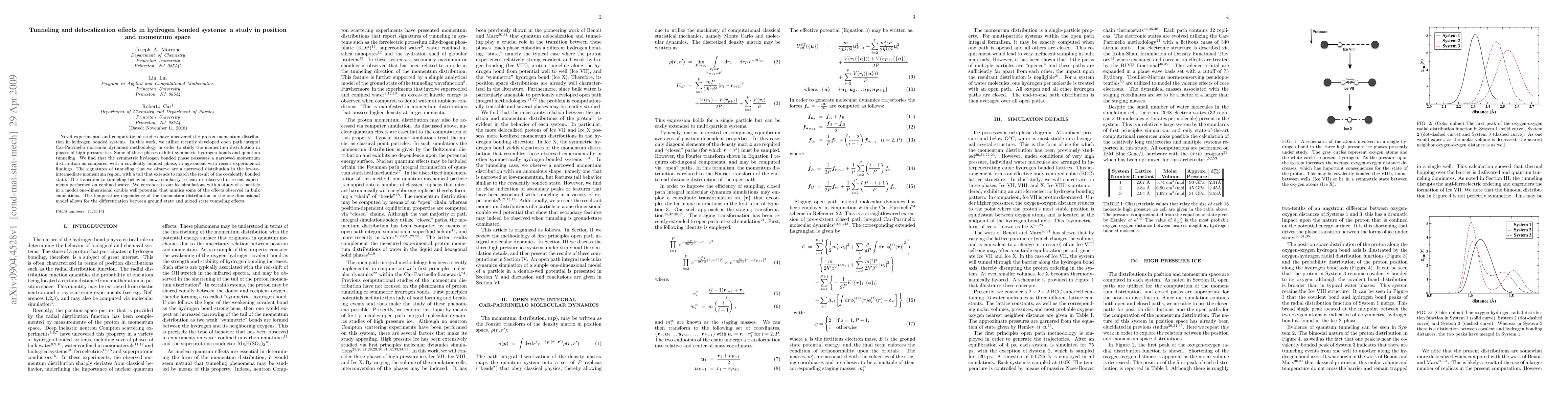 Novel experimental and computational studies have uncovered the proton momentum distribution in hydrogen bonded systems. In this work, we utilize recently developed open path integral Car-Parrinello molecular dynamics methodology in order to study the momentum distribution in phases of high pressure ice. Some of these phases exhibit symmetric hydrogen bonds and quantum tunneling. We find that the symmetric hydrogen bonded phase possesses a narrowed momentum distribution as compared with a covalently bonded phase, in agreement with recent experimental findings. The signatures of tunneling that we observe are a narrowed distribution in the low-to-intermediate momentum region, with a tail that extends to match the result of the covalently bonded state. The transition to tunneling behavior shows similarity to features observed in recent experiments performed on confined water. We corroborate our ice simulations with a study of a particle in a model one-dimensional double well potential that mimics some of the effects observed in bulk simulations. The temperature dependence of the momentum distribution in the one-dimensional model allows for the differentiation between ground state and mixed state tunneling effects.