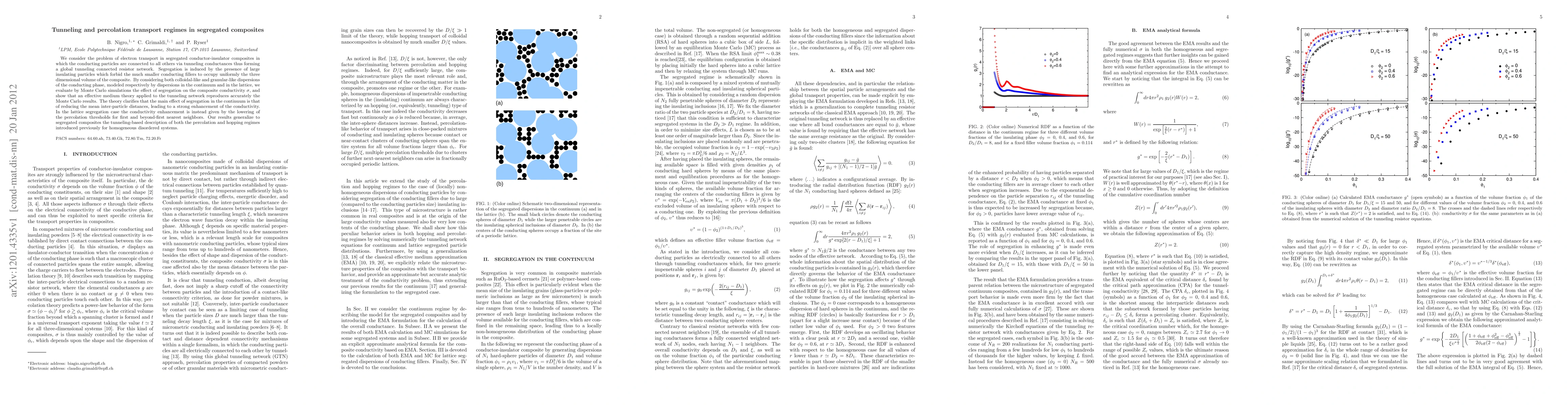 This paper investigates electron transport in segregated conductor-insulator composites, demonstrating that tunneling conductances between connected particles form a global resistor network. Monte Carlo simulations reveal that segregation enhances conductivity by reducing interparticle distances and lowering percolation thresholds, generalizing tunneling-based descriptions to such composites.