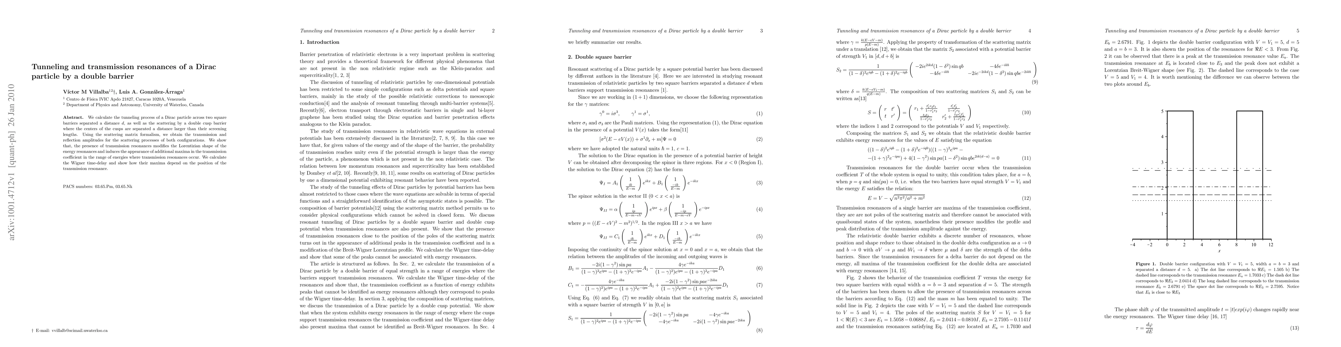 This paper investigates the tunneling and scattering of a Dirac particle through two square barriers and a double cusp barrier, revealing transmission resonances that alter the energy resonance shape and introduce additional peaks in the transmission coefficient. The study also calculates the Wigner time-delay, showing its dependence on the position of these resonances.